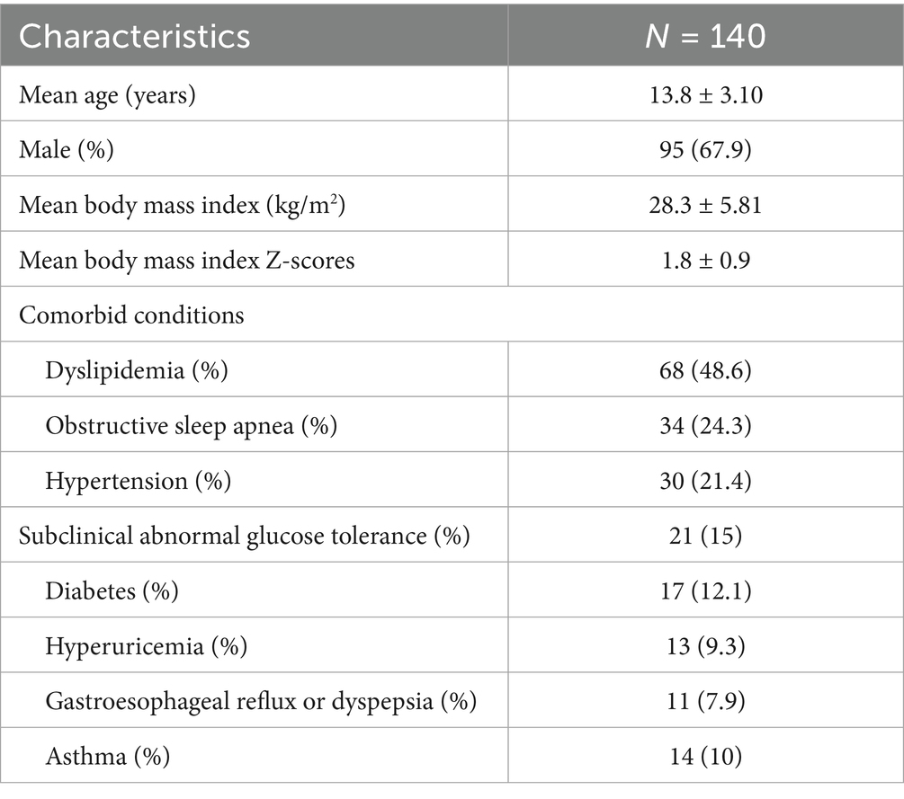 This was a retrospective observational study with longitudinal follow-up of patients over a mean of 2.1 years, involving biannual evaluations and annual VCTE. This analysis included 140 adolescents diagnosed with MASLD, referred from Tianlin Community Health Center to Shanghai Sixth People’s Hospital during the years 2019 to 2023. Ethical approval for this investigation was obtained from the Ethics Committee of Tianlin Community Health Center (Approval number: 2024-KY-017(K)). Eligible patients were aged 10 to 18 years. Hepatic steatosis confirmed by imaging, either ultrasound or computed tomography. The ALT levels persistently exceeding twice the upper limit of normal for more than 3 months. Presence of at least one cardiometabolic risk factor, including overweight or obesity (Overweight and obesity were defined using age- and sex-specific BMI Z-scores: overweight >1 to ≤ 2 SD, obesity >2 SD), dyslipidemia, impaired glucose tolerance or diabetes, or hypertension (2). Exclusion of all other primary liver diseases, determined by clinical history and appropriate diagnostic investigations. This definition is consistent with Chinese guidelines and pediatric evidence indicating that persistent ALT levels exceeding twice the upper limit of normal reliably predict histological steatosis of at least 5%, thereby supporting early detection in community-based practice (2). Exclusion criteria encompassed failure to meet diagnostic standards outlined by the updated Chinese MASLD Prevention and Treatment Guidelines (2018), non-adherence to medical guidance during hospitalization (including irregular medication or premature discharge), and incomplete clinical records such as missing historical data or ≥3 missed follow-up visits.