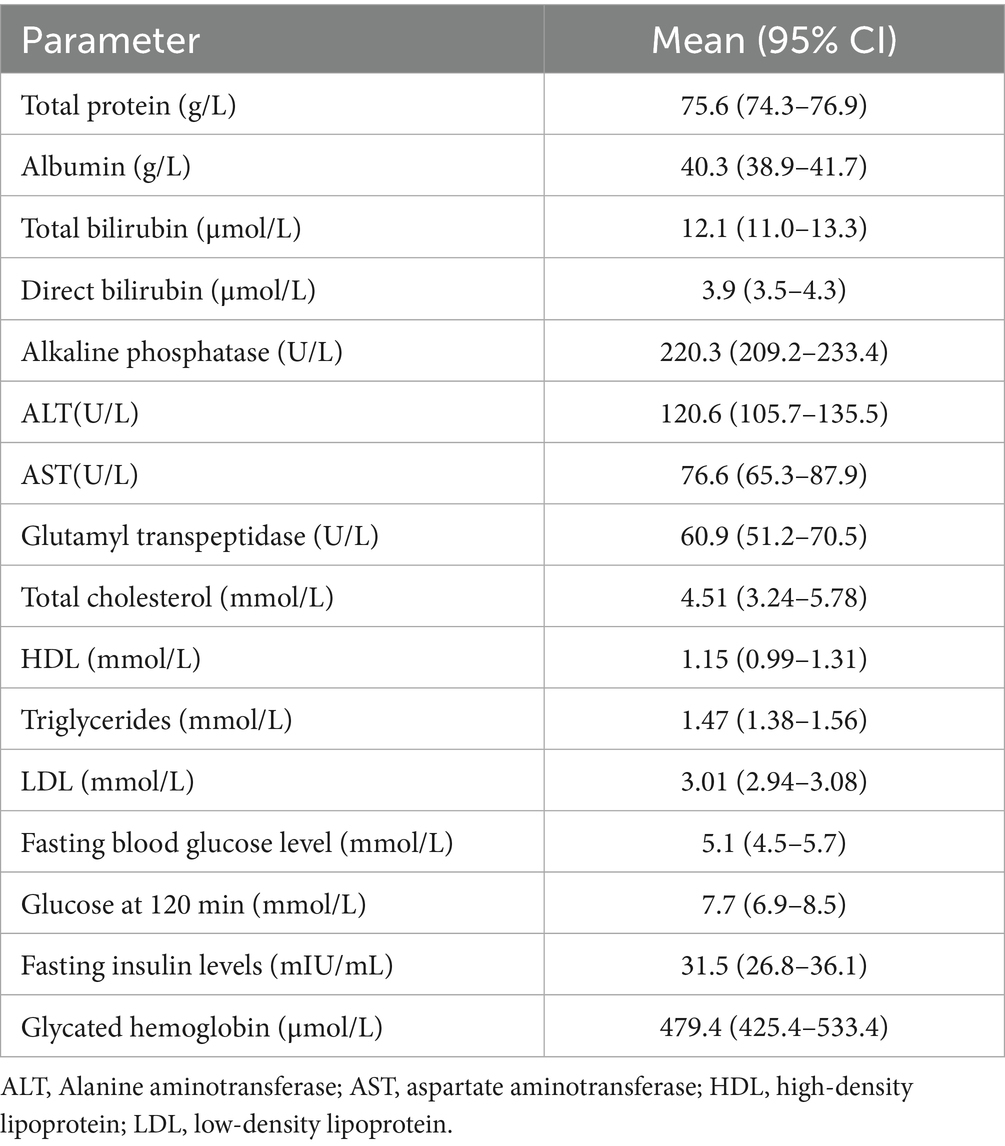 Baseline laboratory characteristics for all patients are presented in Table 2. During follow-up, elevated ALT levels (≥80 U/L) occurred in 85 patients (60.7%). Hepatic steatosis was confirmed via ultrasonography in the entire patient cohort (n = 140). Liver biopsies were conducted in only four cases, all confirming MASH: two patients had mild fibrosis (F0-F1), one exhibited moderate fibrosis (F2), and another presented with cirrhosis (F4).