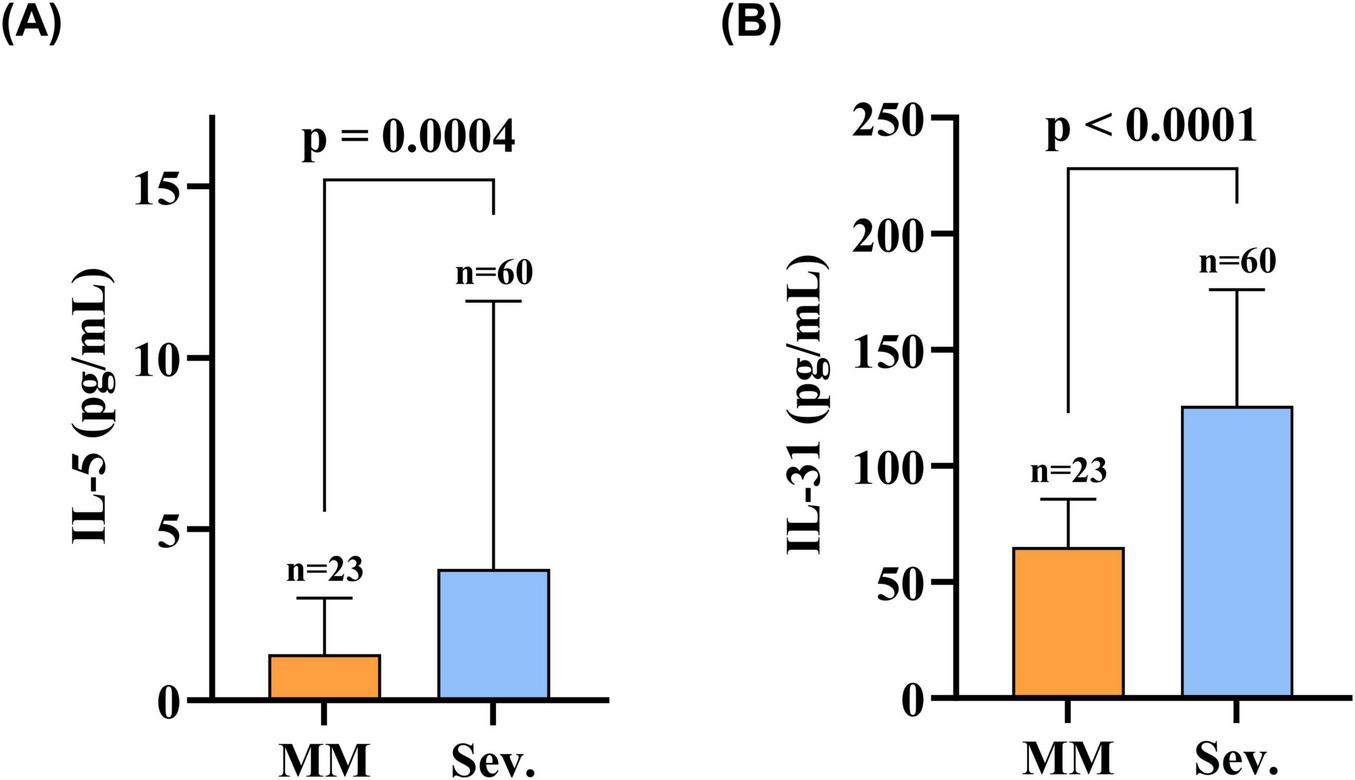 Markedly higher serum levels of both IL-31 and IL-5 were observed in the Sev. group versus the MM group: IL-31 (Sev.: 125.99 [91.58–173.85] pg/mL vs. MM: 65.14 [51.27–85.47] pg/mL; p < 0.0001) and IL-5 (Sev.: 3.84 [1.57–10.63] pg/mL vs. MM: 1.35 [0.83–2.93] pg/mL; p < 0.001); this comparative profile is presented in Figure 2.
