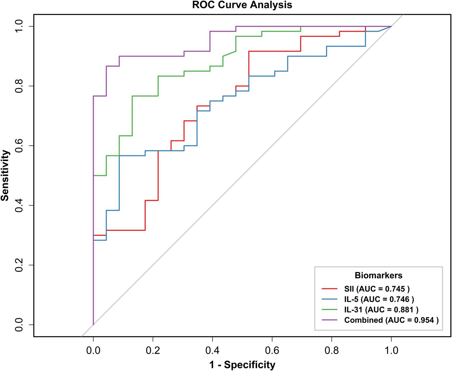Receiver operating characteristic (ROC) curve of SII, IL-31, IL-5, and three indexes combined to predict BP exacerbation. ROC, subject operating characteristic curve; AUC, area under the curve; BSA, body surface area; SII, systemic immunoinflammatory index; IL-31, interleukin 31; IL-5, interleukin 5; Combined, combined prediction.