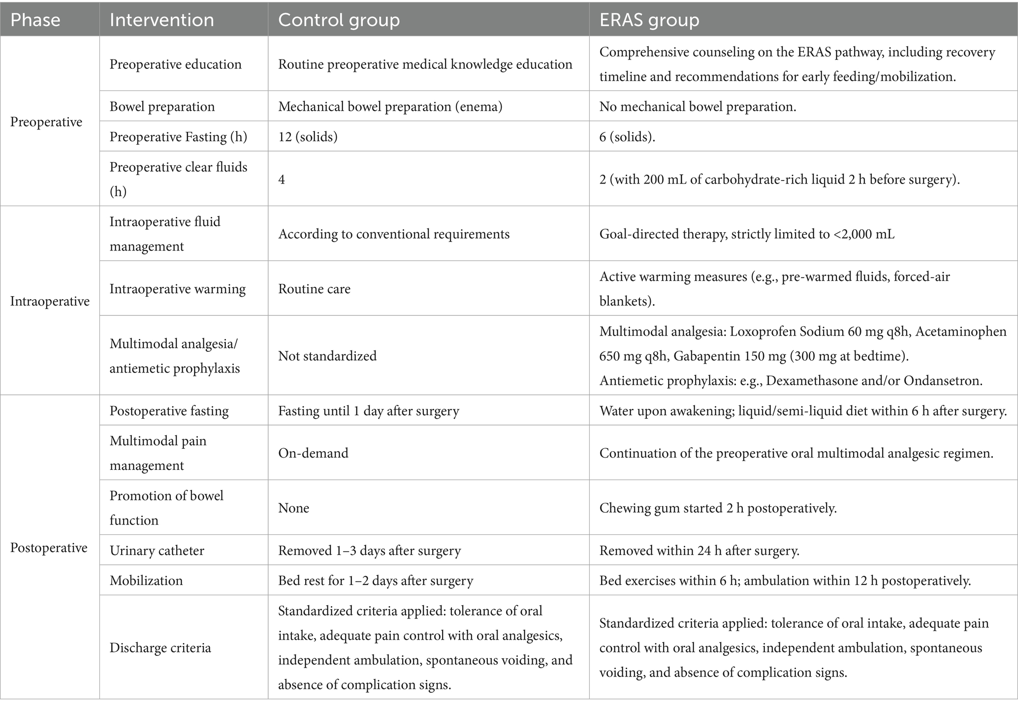Given the absence of an established ERAS protocol specifically for urogynecological procedures, the authors developed a comprehensive ERAS protocol by integrating evidence-based practices from colorectal surgery, gynecological surgery, and their clinical expertise (14, 15). All surgical procedures were performed by the same dedicated gynecological surgical team, which ensured consistency in surgical technique and perioperative management throughout the study period. To ensure standardization, a detailed written protocol (as summarized in Table 1) was distributed to all involved healthcare staff, including surgeons, anesthesiologists, and ward nurses. A dedicated briefing session was conducted prior to study initiation to ensure consistent understanding and application. Compliance with key ERAS elements was actively monitored by the research nursing team through a standardized checklist integrated into the patient’s medical record. Compliance with the key ERAS elements was excellent, exceeding 95% across the cohort. In contrast, the control group received conventional perioperative care following standard institutional protocols. Details about the specific implementation of ERAS are shown in Figures 1, 2 and Table 1. In brief, our ERAS program for patients with POP consists of three components: preoperative, intraoperative, and postoperative interventions. Key measures that distinguished the ERAS group from the control group preoperatively included: no mechanical bowel preparation, shorter durations of preoperative fasting and fluid deprivation, and avoidance of sedative drugs. Key intraoperative measures included: the use of short-acting, low-emetogenic anesthetic drugs, the application of active warming measures for surgeries exceeding 30 min, and the restriction of intraoperative fluid intake to within 2,000 mL. The postoperative ERAS protocol was characterized by several key measures: the implementation of multimodal antiemetic therapy, avoidance of nasogastric tube placement, minimization of drain usage, NSAID-based multimodal analgesia, postoperative gum chewing to enhance gastrointestinal motility, early initiation of oral feeding, reduced duration of indwelling urinary catheterization, promotion of early ambulation, and facilitation of earlier hospital discharge based on standardized criteria.