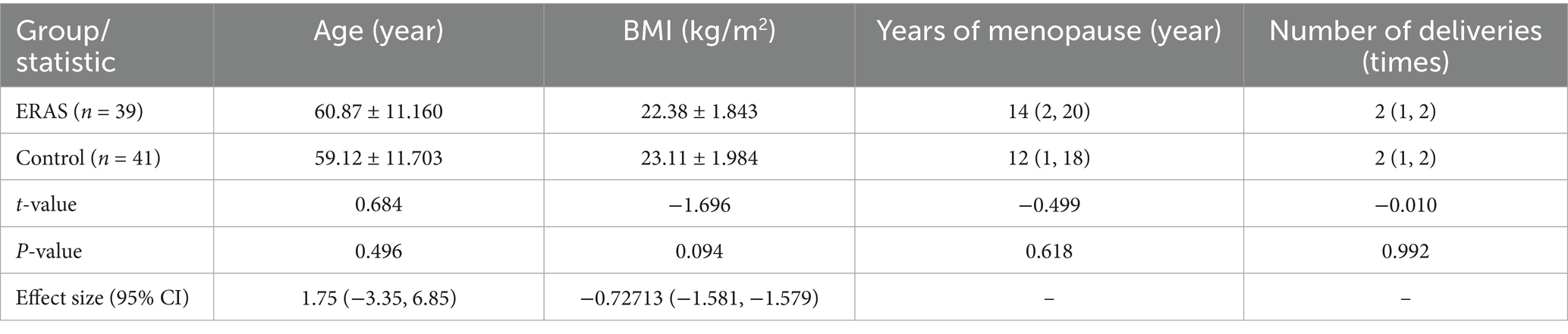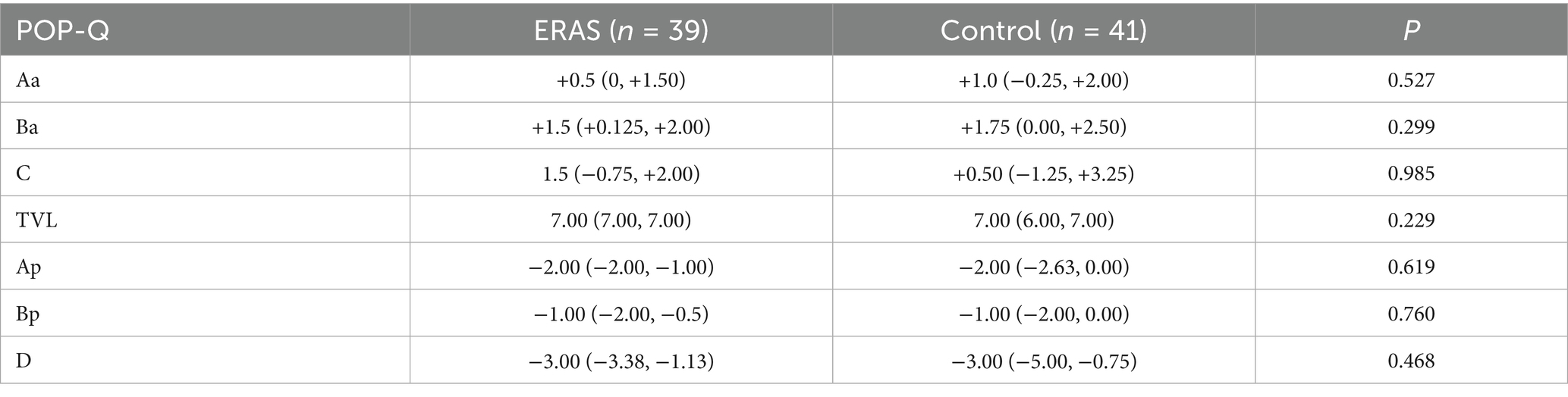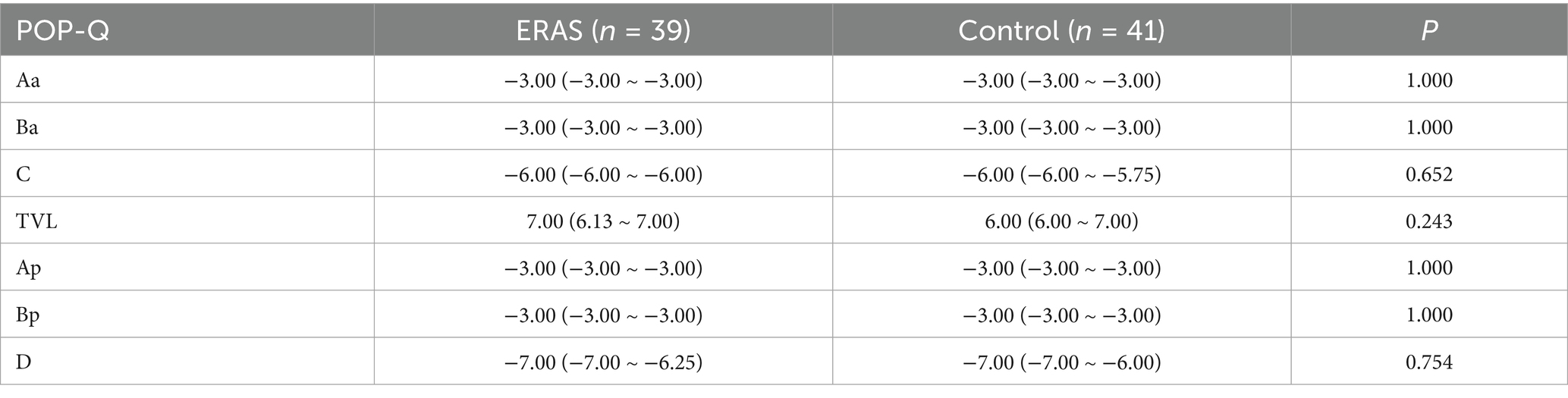 A total of 80 patients diagnosed with pelvic organ prolapse (POP) who underwent pelvic floor reconstruction surgery were enrolled in this study. All patients completed a 30-day outpatient follow-up. The final analysis included 39 patients in the ERAS group and 41 in the control group. Preoperative systematic assessment showed no statistically significant differences between the two groups in baseline characteristics, including age, body mass index (BMI), duration of prolapse, parity, or pelvic organ prolapse quantification (POP-Q) scores (Tables 2, 3).