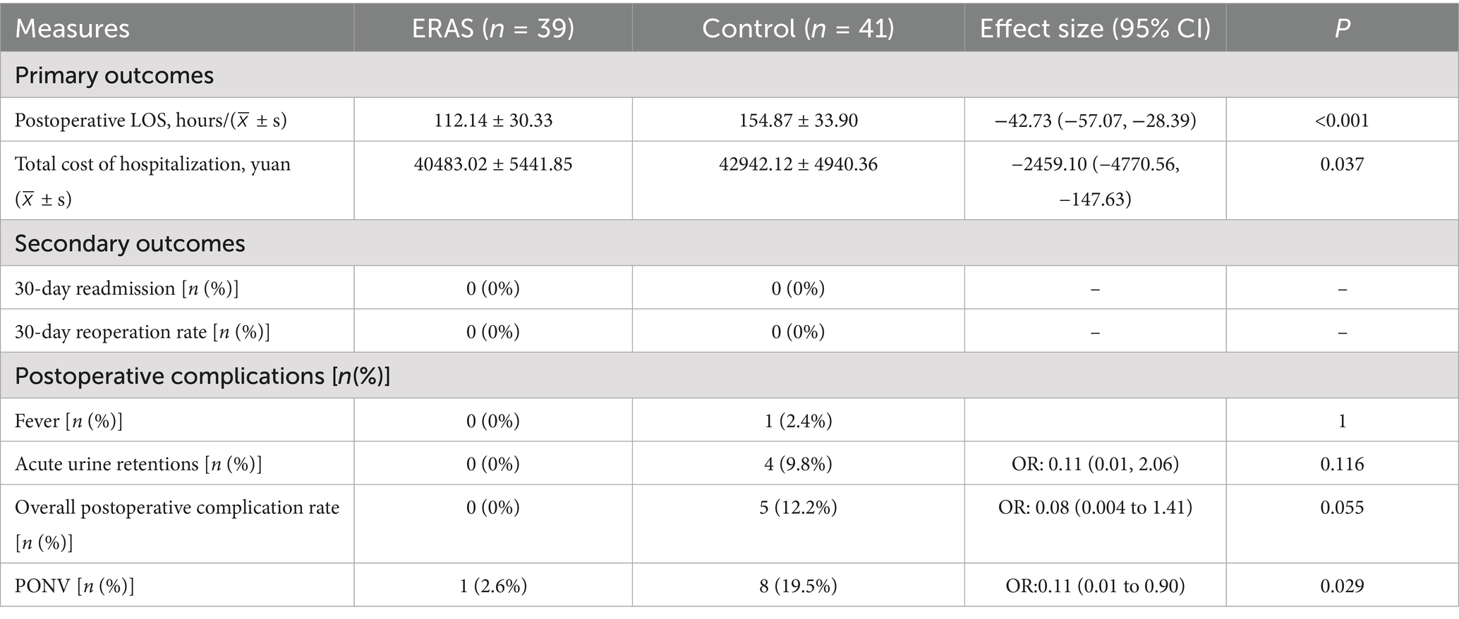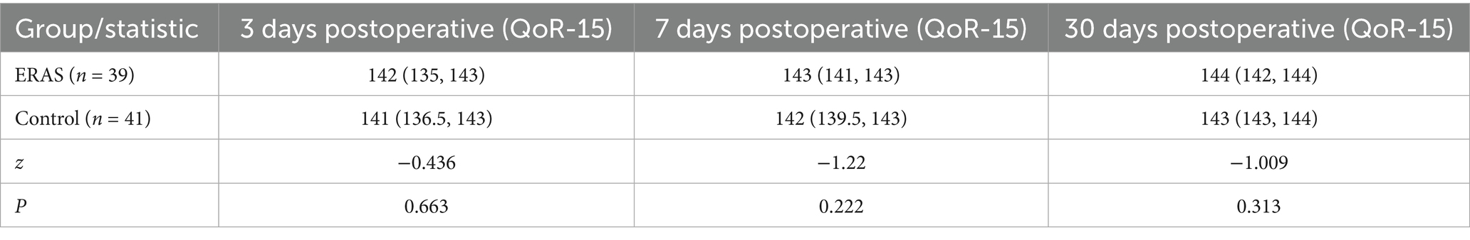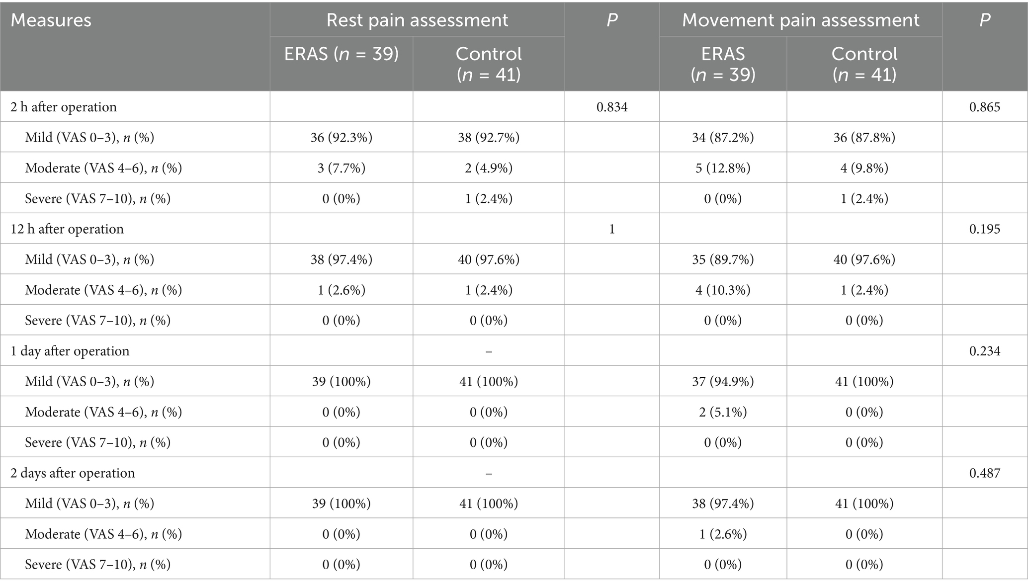Notably, despite multimodal analgesia in the ERAS group, postoperative pain scores showed no significant intergroup difference. This may be partly explained by the inclusion of middle-aged and elderly patients with potentially reduced pain sensitivity (30), leading to lower baseline scores in both groups. Additionally, it is important to acknowledge that the relatively small sample size may have limited the statistical power of our study, not only constraining the ability to detect a significant difference in pain scores but also potentially masking differences in less frequently occurring outcomes, such as specific complications.