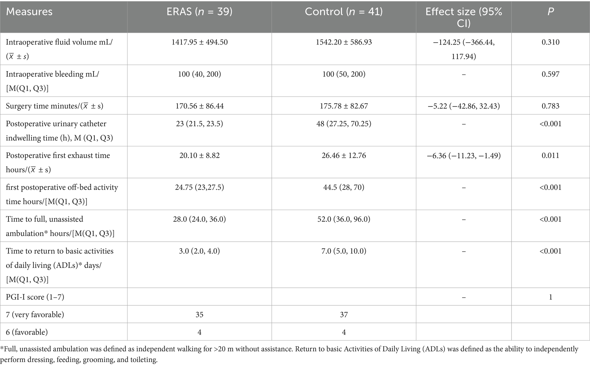No significant differences were observed between the ERAS and control groups in other intraoperative indicators, including fluid administration, blood loss, or operative time (all p > 0.05; Table 5). However, the ERAS group showed significantly accelerated recovery across multiple functional metrics, with shorter durations of urinary catheter indwelling, time to first flatus, time to first ambulation, time to full unassisted ambulation, and time to return to basic activities of daily living (ADLs) (all p < 0.05; Table 5).