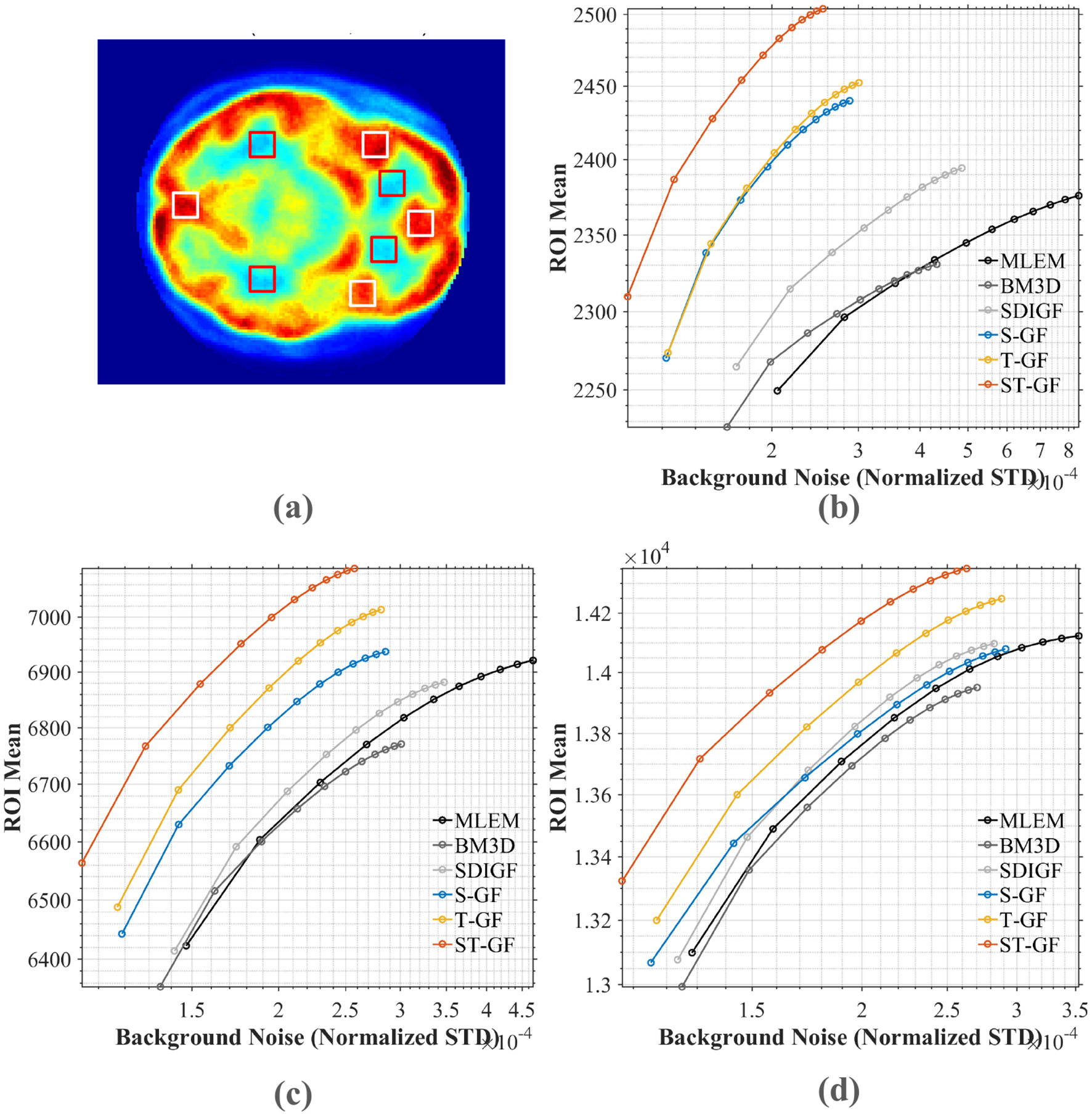 The performance of the proposed ST-GF method was evaluated against several methods, including BM3D, SDIGF, and two ablative variants of our method: a spatial-only filter (S-GF) and a temporal-only filter (T-GF). All methods first denoise the dynamic sinogram data, after which reconstruction is uniformly performed using the MLEM algorithm for 100 iterations. Its implementation is based on the iterative update rule defined in Equation 2 and was realized using reconstruction code from the KEM Toolbox (https://wanglab.faculty.ucdavis.edu/code). The parameter settings for the compared methods are as follows: BM3D: the parameter σ was set to 15. SDIGF (10): the neighborhood size was set to 10, and the smoothing parameter was set to 0.5.