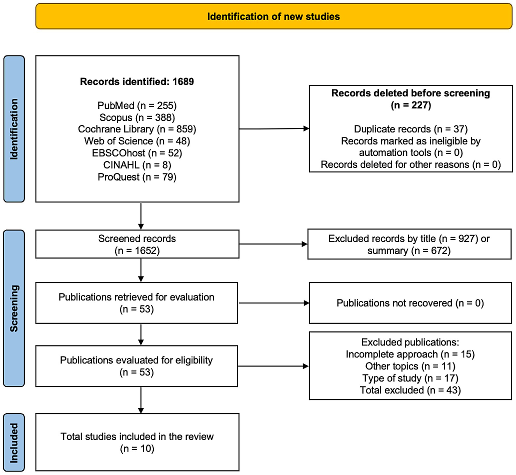 A total of 1,689 studies were identified through the database search, with 37 excluded as duplicates. Of the remaining 1,652 records, 1,599 were excluded after screening titles and abstracts for relevance (927 based on titles and 672 based on abstracts). A full-text review was conducted for 53 references, of which 43 were excluded for not meeting the inclusion criteria: 15 due to incomplete approaches, 11 for unrelated topics, and 17 for not matching the required study design. Ultimately, 10 studies were included in the systematic review and meta-analysis (21, 37–45). The search and selection process is illustrated in a PRISMA flowchart (Figure 1) (46).