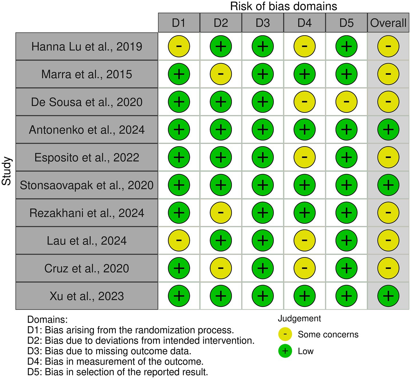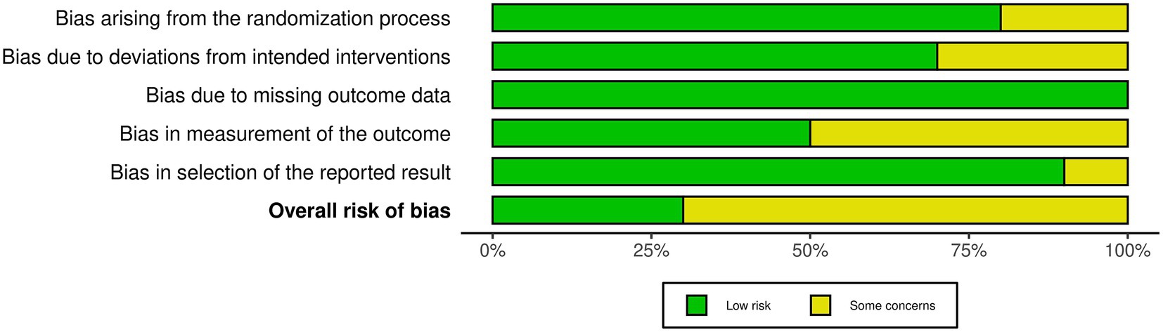 Three studies were assessed as having a low risk of bias across all domains (39, 41, 45). Seven studies showed some concerns in one or more domains (21, 37, 38, 40, 42–44). None of the studies were classified as having a high risk of bias. Overall, the risk of bias was considered moderate, with most studies presenting some concerns and only a few demonstrating low risk across all domains. The risk of bias assessment is presented in Figures 2, 3.