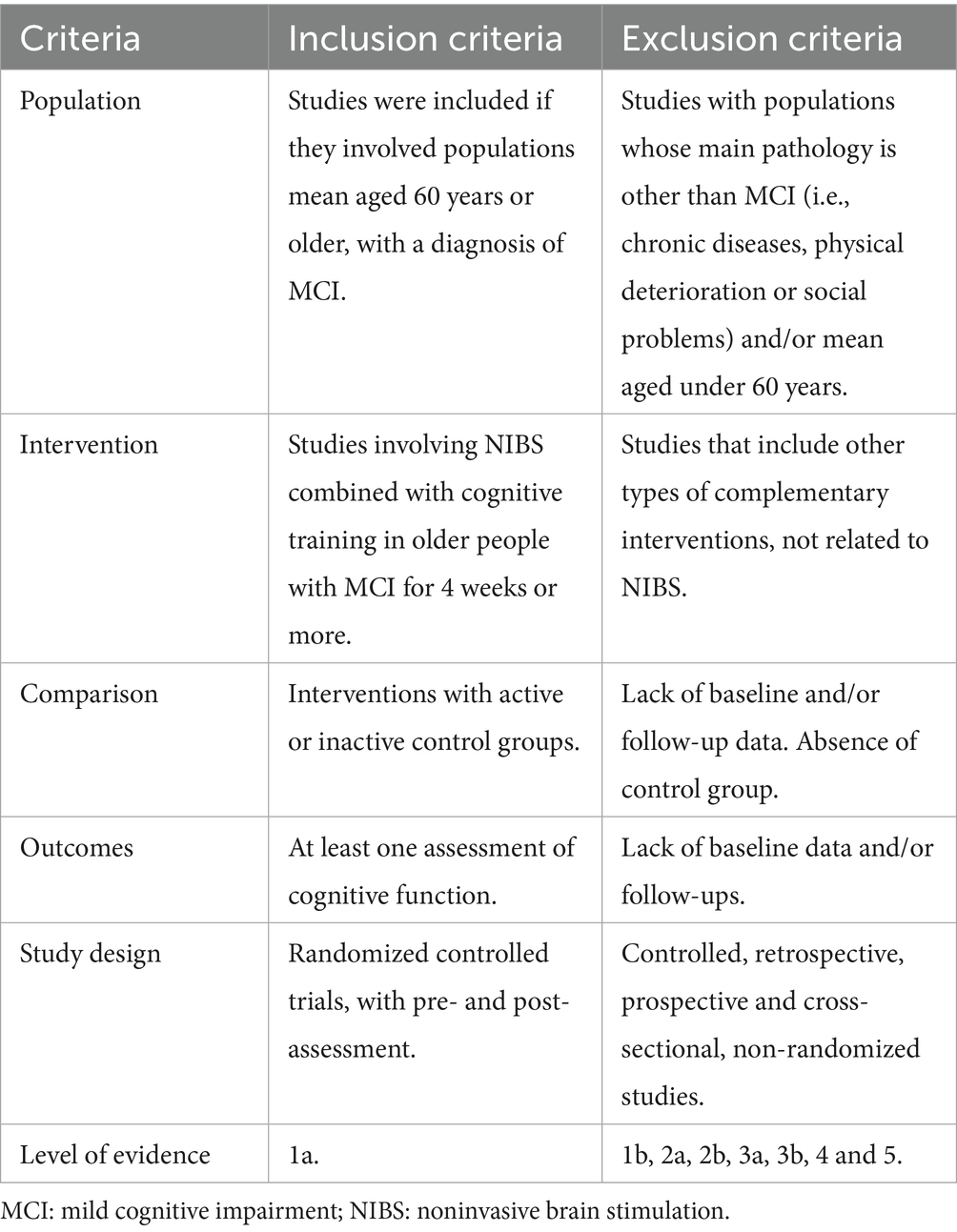 The methodological quality of the included studies was rated as high. All 10 studies were randomized controlled trials (RCTs) (21, 37–45), representing the highest level of evidence (level 1a) according to the Oxford Scale. This study design minimized the risk of bias and provided a robust basis for evaluating the effectiveness of interventions involving NIBS combined with cognitive training in older peoples with MCI.