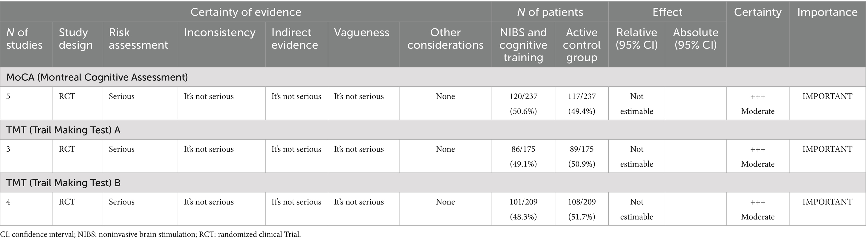 The meta-analysis revealed significant moderate effects (p < 0.05) in favor of NIBS combined with cognitive training for TMT-A (p = 0.04). In contrast, no significant differences were found for TMT-B. One RCT reported that the combination of tDCS and Nintendo Switch significantly improved performance on both TMT-A (p = 0.03) and TMT-B (p = 0.04) in individuals with chronic stroke, suggesting that interactive training may enhance the effects of brain stimulation (53). Similar findings were reported in an RCT with 103 participants diagnosed with depression who received tDCS, where a significant improvement in TMT-A performance was observed (p ≤ 0.02), indicating enhanced processing speed (49). However, a placebo-controlled RCT involving 25 patients with Alzheimer’s disease, in which tDCS was applied to the left temporal cortex over six sessions, reported no significant effects on either TMT-A (p = 0.378) or TMT-B (p = 0.093) (54). Overall, the findings suggested that NIBS combined with cognitive training improved certain cognitive abilities, particularly processing speed and general cognitive performance, as reflected in TMT-A and MoCA scores. However, its effects on more complex executive tasks, such as those measured by TMT-B, remained less clear. Research using tDCS and tACS has shown promising benefits for executive function and working memory, and plasticity though results vary depending on the specific task and the population studied (55).