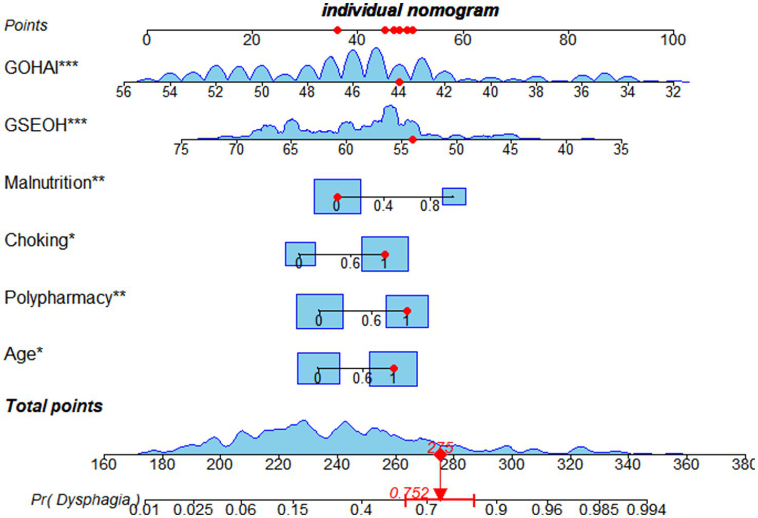 Oral health-related self-efficacy also emerged as a key influencing factor. Self-efficacy reflects an individual’s belief in their ability to manage health behaviors. Lower oral health self-efficacy may result in neglect of oral hygiene and reduced adherence to oral care routines, thereby increasing the risk of oral diseases and indirectly affecting swallowing function. Studies have shown (31) that improving oral health self-efficacy enhances proactive participation in oral hygiene, which in turn reduces the risk of dysphagia. Health education, personalized counseling, and behavioral interventions can be used to improve older adults’ confidence and ability to manage oral health.