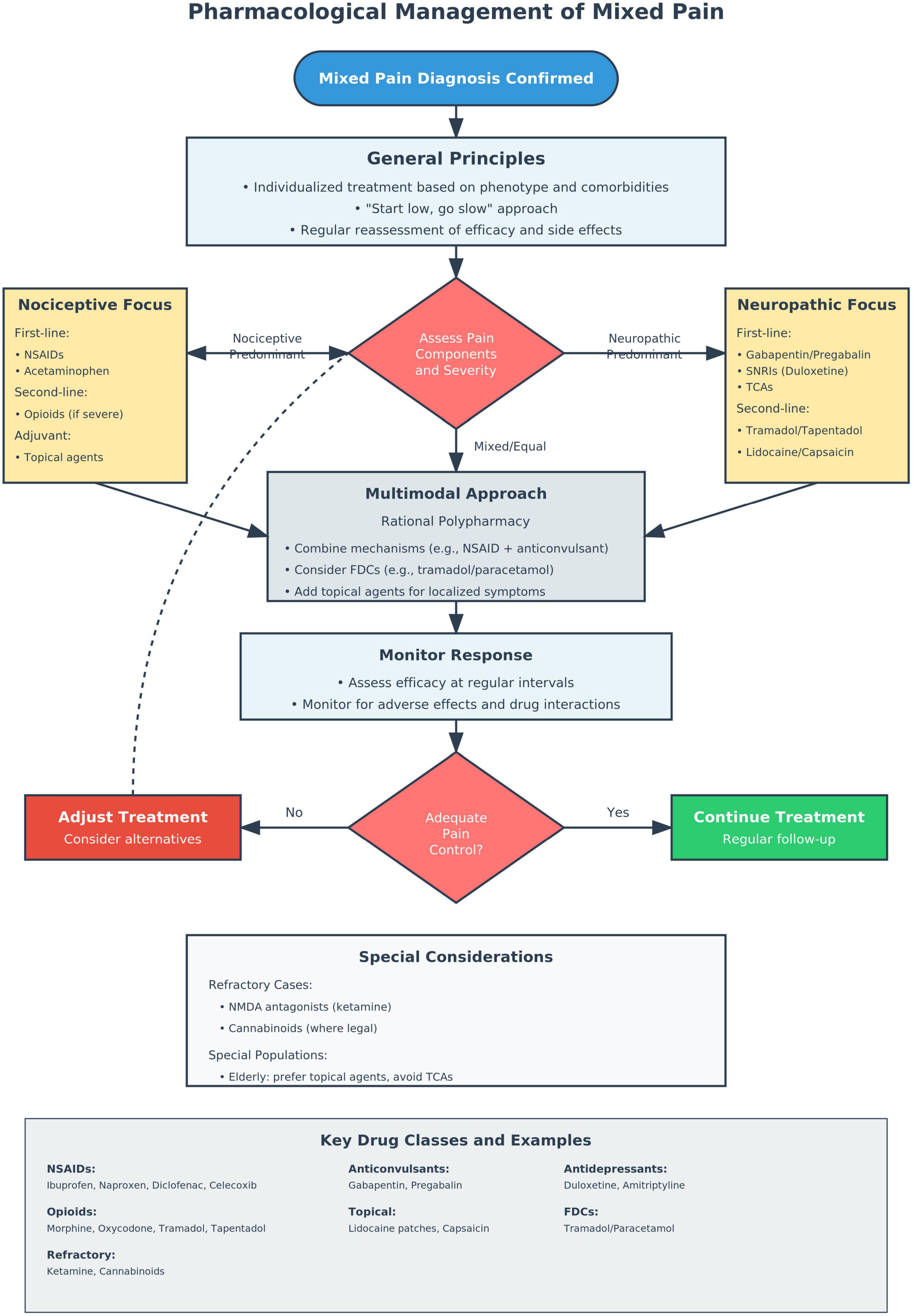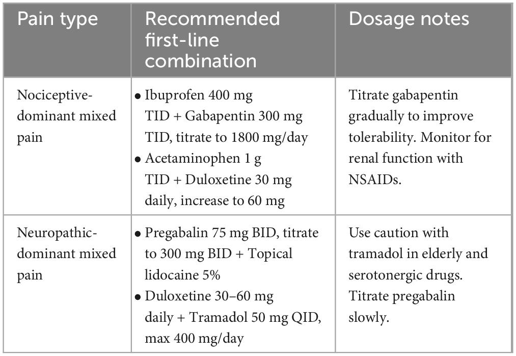 Management of mixed pain is inherently challenging due to its mechanistic heterogeneity, variable clinical presentation, and partial responsiveness to unimodal treatments (1, 12–15). NSAIDs may alleviate inflammation-driven nociceptive pain, while having limited efficacy for neuropathic components (16); conversely, agents such as gabapentinoids or antidepressants target neuropathic mechanisms but may not address nociceptive or inflammatory pain (17). Therefore, multimodal and mechanism-based therapeutic strategies, combining pharmacologic interventions (NSAIDs, opioids, gabapentinoids, antidepressants) with non-pharmacologic modalities (physical rehabilitation, psychological support, neuromodulation and interventional procedures), are recommended.