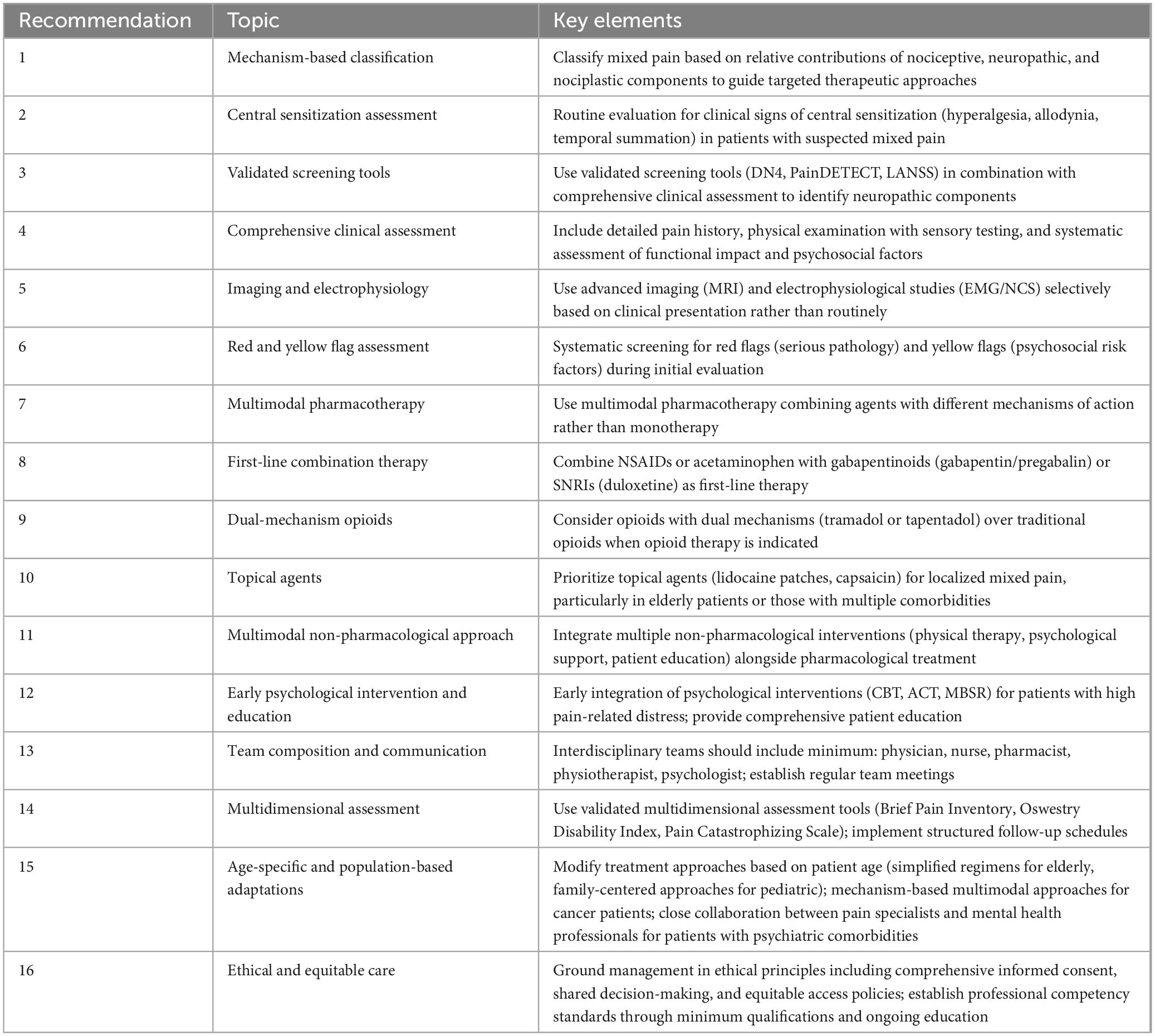 Mixed pain, defined by the concurrent involvement of nociceptive, neuropathic, and sometimes nociplastic mechanisms, poses a significant diagnostic and therapeutic challenge within modern pain medicine. This complex pain phenotype is increasingly recognized as a prevalent and burdensome clinical entity, yet it remains substantially underdiagnosed and sub-optimally managed across diverse healthcare settings. Epidemiological data indicate that mixed pain affects a substantial proportion of patients with chronic pain syndromes and is consistently associated with more severe symptomatology, prolonged pain duration, functional impairment, diminished quality of life, and escalated healthcare resource utilization compared to pain of a single mechanism. In response to this unmet clinical need, the present recommendations aim to provide a structured, evidence-informed framework for the diagnosis and management of mixed pain. Developed through a rigorous process involving systematic literature review and multidisciplinary expert consensus, this document emphasizes the importance of mechanism-based therapeutic strategies tailored to the individual patient’s pain profile. Central to the approach is the implementation of multimodal and interdisciplinary care models that address the biological, psychological, and functional dimensions of mixed pain. These recommendations are intended for a broad spectrum of healthcare professionals, including primary care physicians, pain specialists, neurologists, oncologists, physiatrists, nurses, pharmacists, physical and occupational therapists, and clinical psychologists. The target population encompasses patients affected by mixed pain conditions such as chronic low back pain with radiculopathy, cancer-related pain, persistent post-surgical pain, and osteoarthritis complicated by central sensitization. By facilitating accurate diagnosis and integrated treatment planning, these recommendations seek to advance clinical practice, reduce the burden of mixed pain, and enhance patient-centered outcomes. This guidance aims to transform mixed pain care by promoting mechanism-based, multidisciplinary strategies with direct clinical applicability.