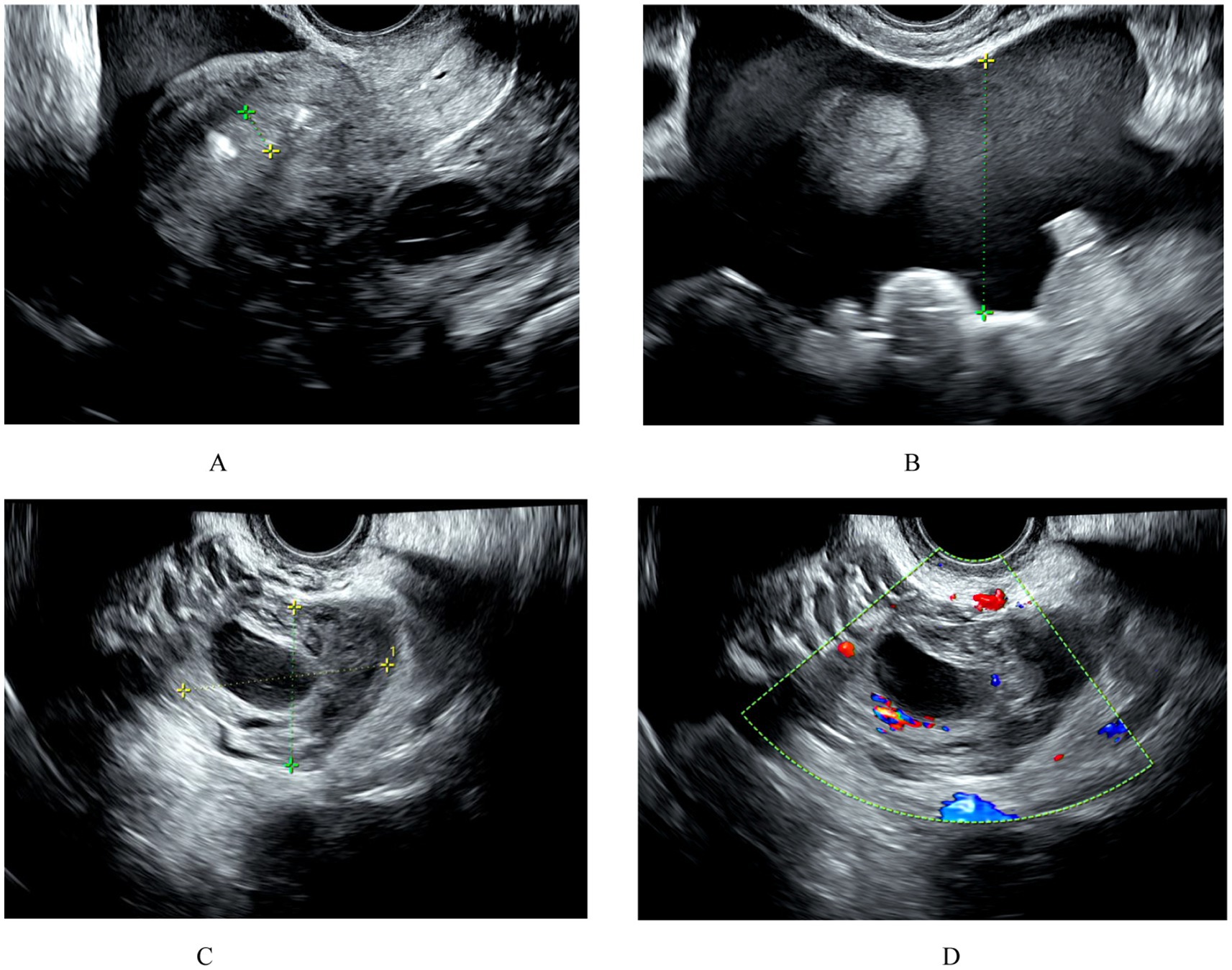 Figure 1. (A) The endometrium is thickened to 1.1 cm. An IUD is visible in the uterus, and its position is correct. No gestational sac is seen in the uterus. (B) Hemorrhagic fluid is visible in the pelvic cavity. (C,D) A mixed echo of 5.1 × 3.6 cm is seen in the left adnexal region, and ectopic pregnancy is suspected on ultrasound.