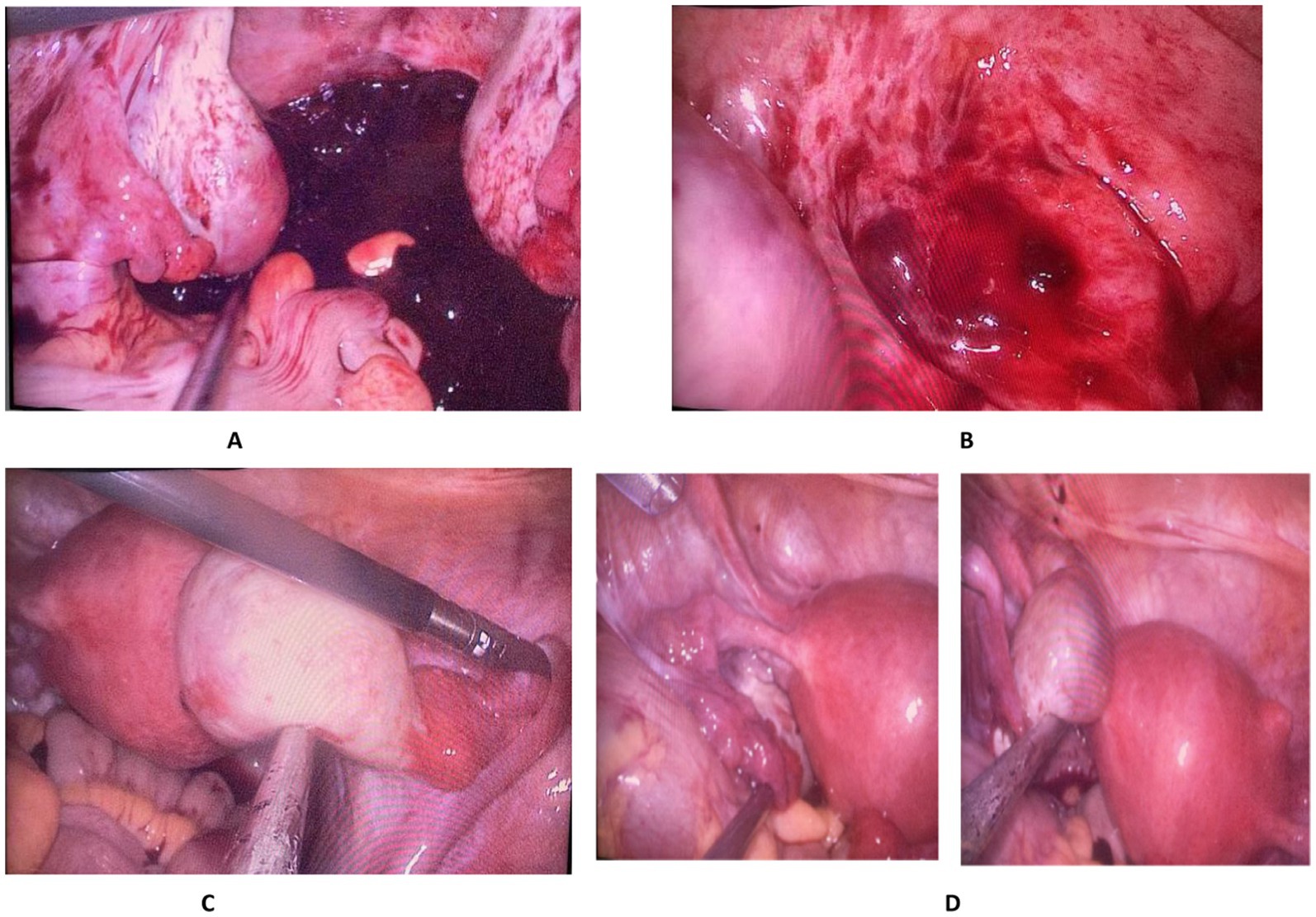 Figure 2. (A) Hemoperitoneum in the pelvic and abdominal cavities; (B) Bleeding site on the rectum; (C) The right fallopian tube and ovary show no bleeding sites or gestational lesions, with a corpus luteum cyst visible on the right ovary. (D) The left fallopian tube and ovary show no bleeding sites or gestational lesions, with a corpus luteum cyst visible on the right ovary.