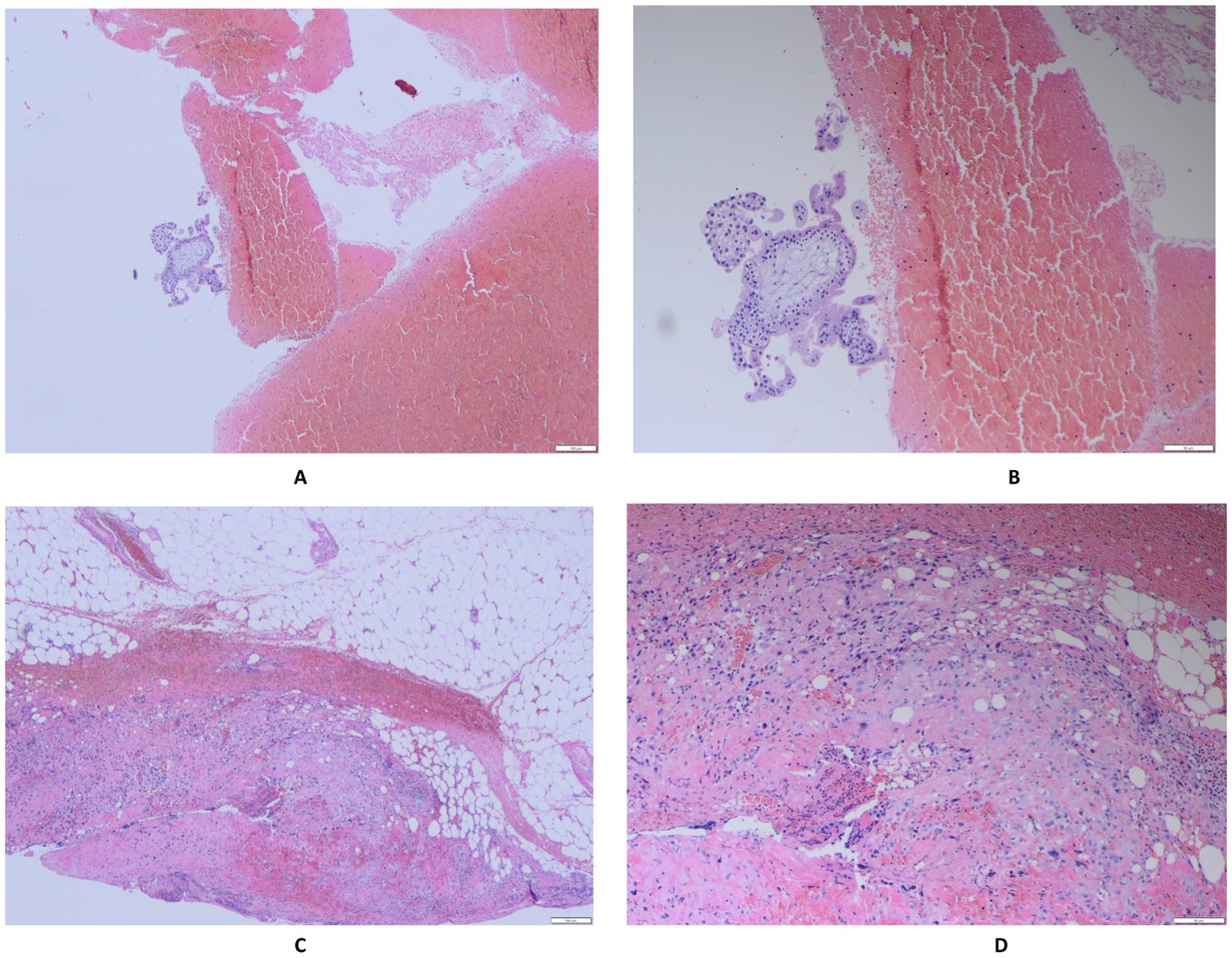 Figure 3. (A,B) (Pelvic hematoma) Chorionic villi and infiltrating trophoblastic cells are observed. (C,D) (Gestational tissue attached to the rectum) Infiltrating trophoblastic cells are present.