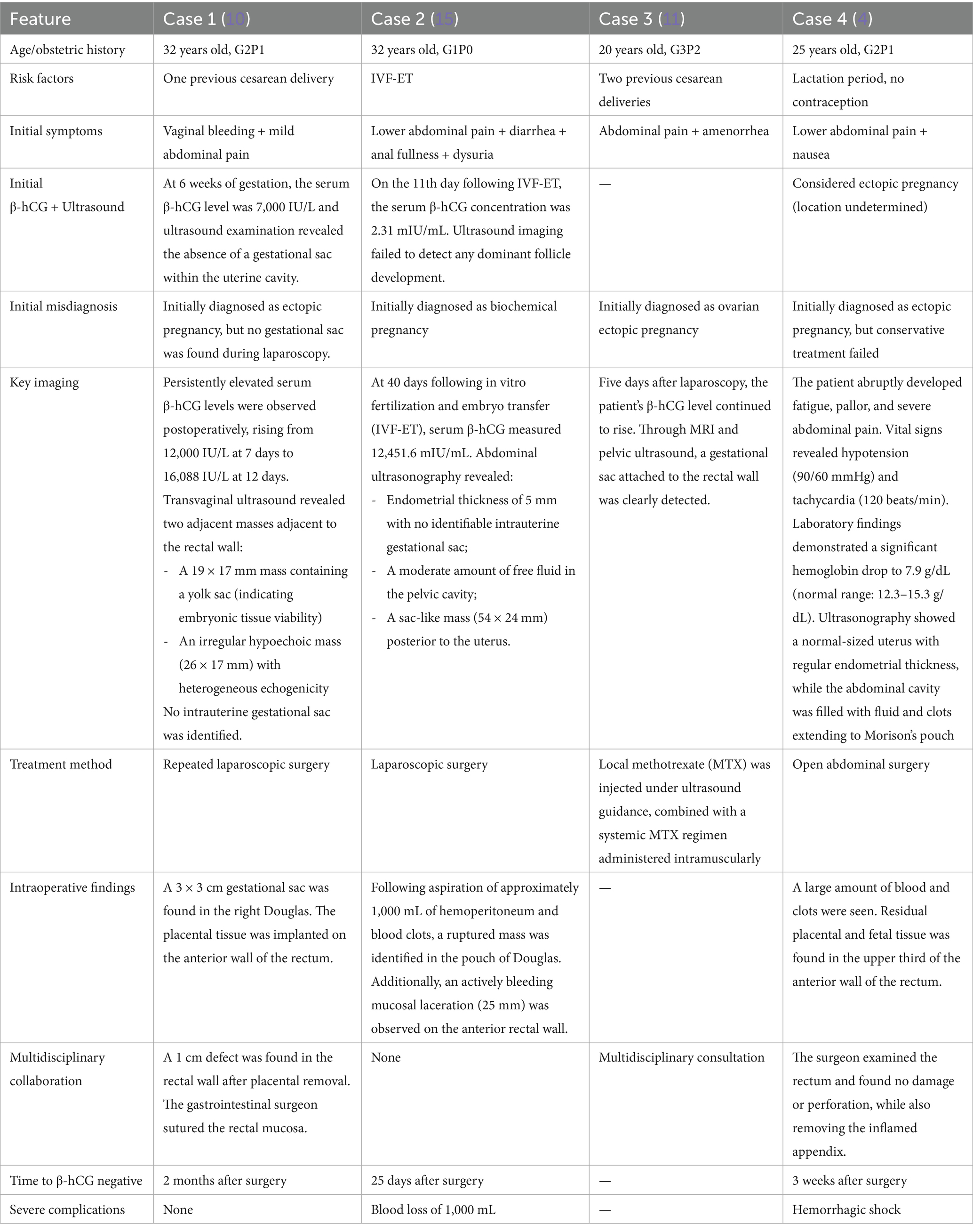 Table 1. Comparative analysis of clinical characteristics and treatment outcomes in rectal ectopic pregnancies: a literature review.