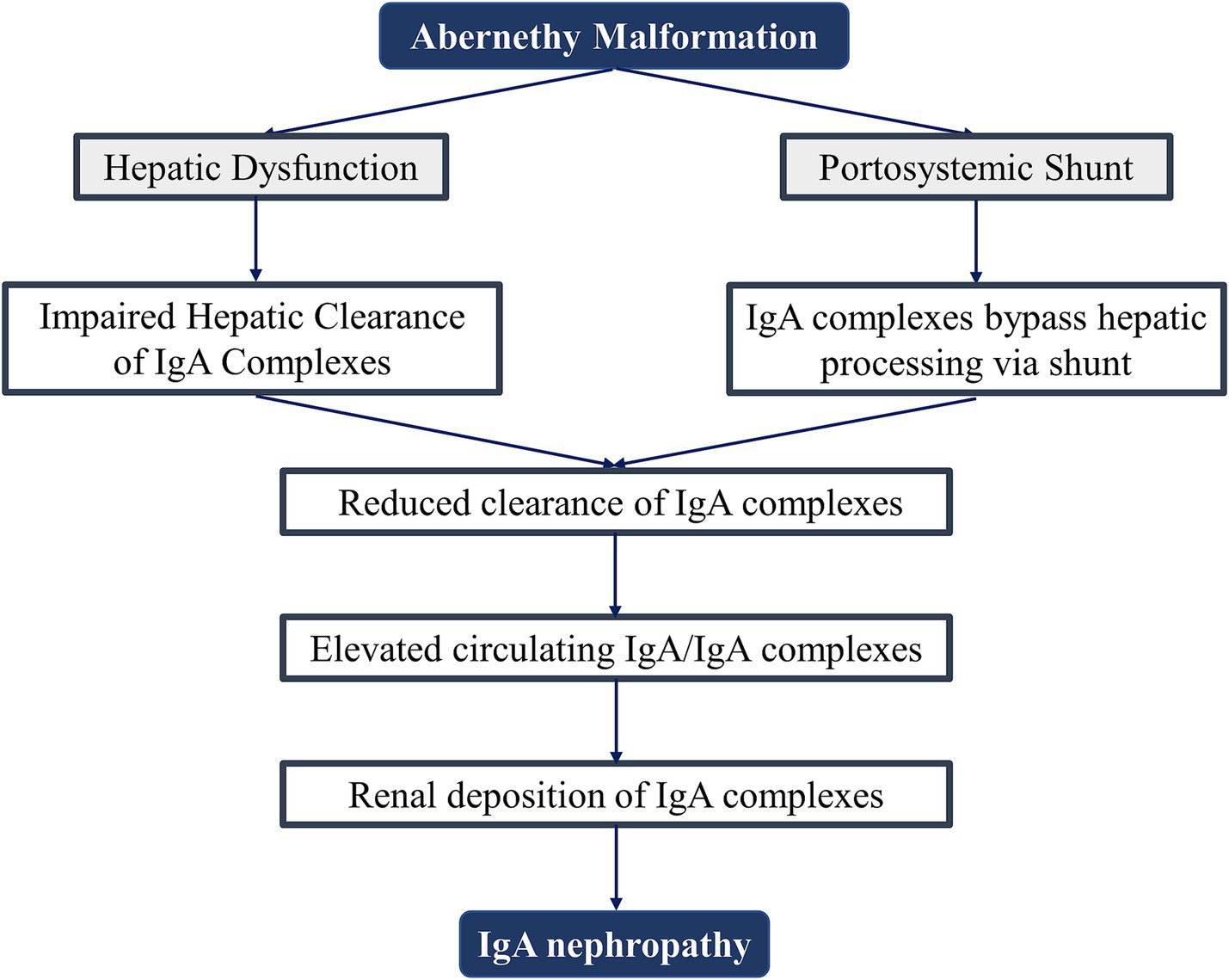 Furthermore, Dash et al. demonstrated that patients with non-cirrhotic portal fibrosis undergoing splenorenal shunt surgery exhibited increased IgA nephropathy incidence attributable to augmented portosystemic shunting with compromised hepatic clearance. In contrast, those with extrahepatic portal vein obstruction and preserved hepatic parenchymal function showed no post-procedural nephritis escalation (19). This implies that IgAN development is jointly governed by shunt magnitude and hepatic immunological clearance capacity (Figure 3), explaining both the absence of universal renal involvement in Abernethy malformation and the substantial age-of-onset heterogeneity.