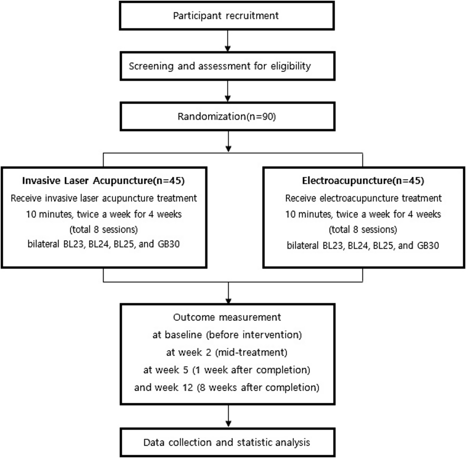 Figure 1. Study design flow chart. Flow diagram of the randomized controlled trial comparing invasive laser acupuncture (ILA) and electroacupuncture (EA) in 90 patients with non-specific chronic low back pain. Participants were randomly assigned to receive ILA or EA twice weekly for 4 weeks. Outcomes were assessed at baseline, mid-treatment (week 2), 1 week after completion (week 5), and 8 weeks after completion (week 12).