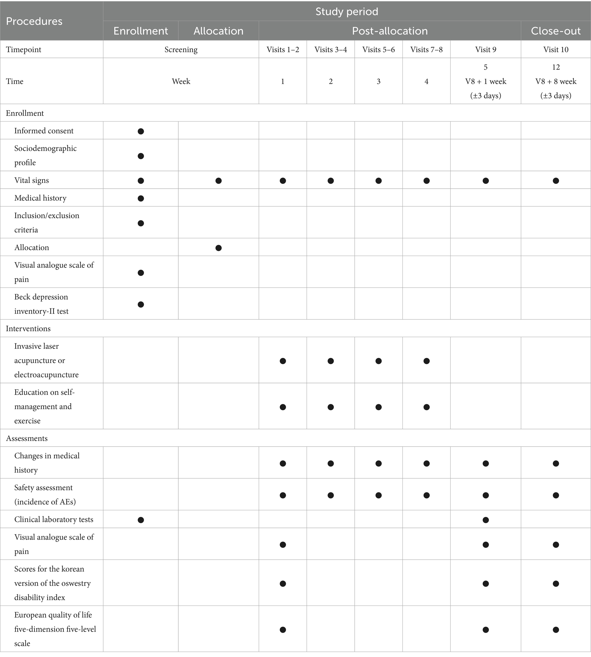 Secondary outcomes include the proportion of responders at Visit 9. A responder is defined as a participant who shows a ≥ 30% reduction in VAS score compared to baseline without an increase in the type or dosage of pain medication. This definition follows standard criteria for assessing clinically meaningful improvement in chronic LBP (22, 23). Additional secondary outcomes include changes in VAS scores at the fifth treatment session (Visit 5) and at 8 weeks (±3 days) after treatment completion (Visit 10). Functional disability will be assessed using the ODI, and health-related quality of life will be measured using the EQ-5D-5L. Changes in both scores will be analyzed at Visits 5, 9, and 10 relative to baseline (Visit 1).