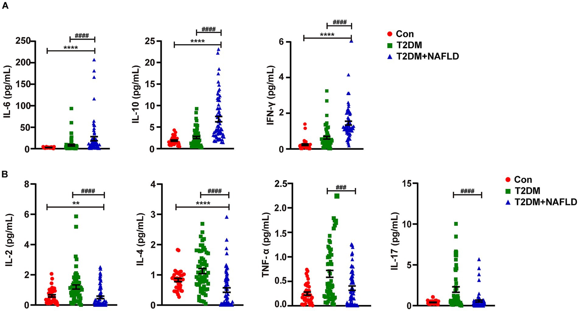 Scatter plots showing cytokine levels in three groups: Con (red circles), T2DM (green squares), and T2DM+NAFLD (blue triangles). Panel A displays IL-6, IL-10, and IFN-γ, while Panel B shows IL-2, IL-4, TNF-α, and IL-17. Significant differences are indicated with asterisks and hashes. Con generally shows lower cytokine levels compared to T2DM and T2DM+NAFLD groups.