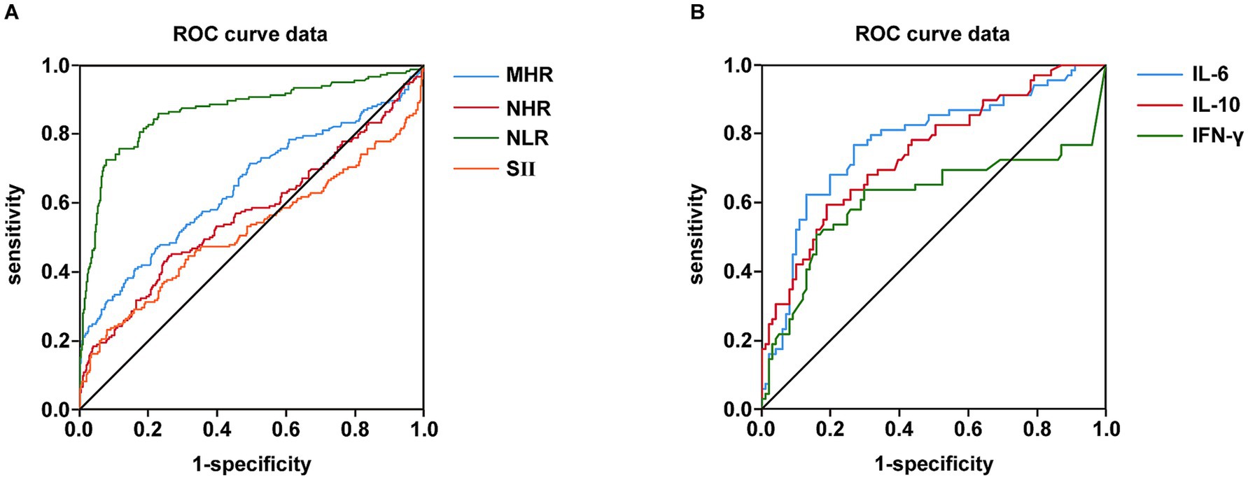 Two ROC curve graphs labeled A and B compare sensitivity against one minus specificity. Graph A includes curves MHR (blue), NHR (red), NLR (green), and SII (orange). Graph B features curves IL-6 (blue), IL-10 (red), and IFN-γ (green). Each graph evaluates different biomarkers for performance visualization.