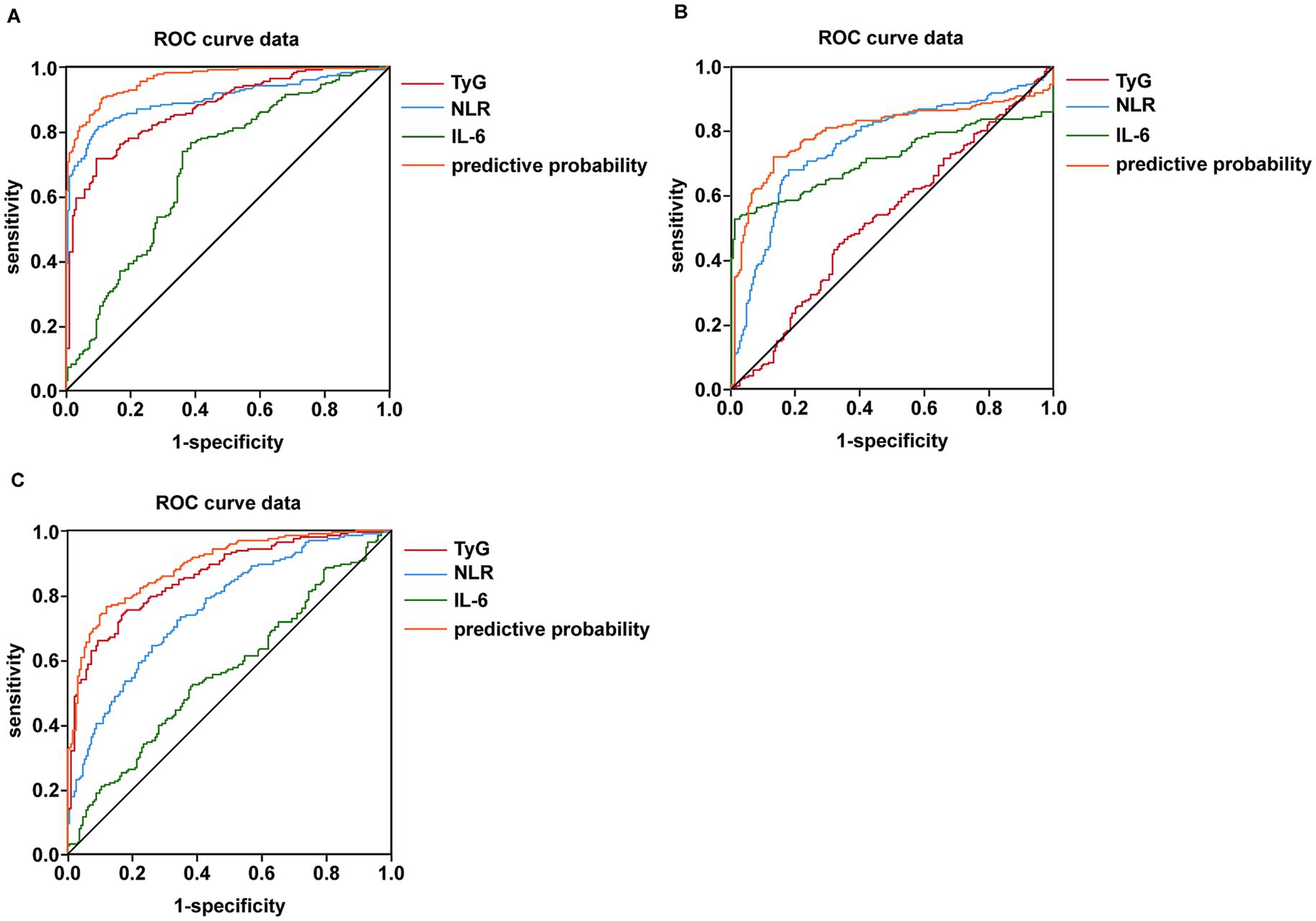 Three ROC curves labeled A, B, and C compare the diagnostic performance of TyG, NLR, IL-6, and predictive probability. Each graph plots sensitivity on the y-axis against one minus specificity on the x-axis. TyG is in red, NLR in blue, IL-6 in green, and predictive probability in orange, showing different levels of diagnostic accuracy.