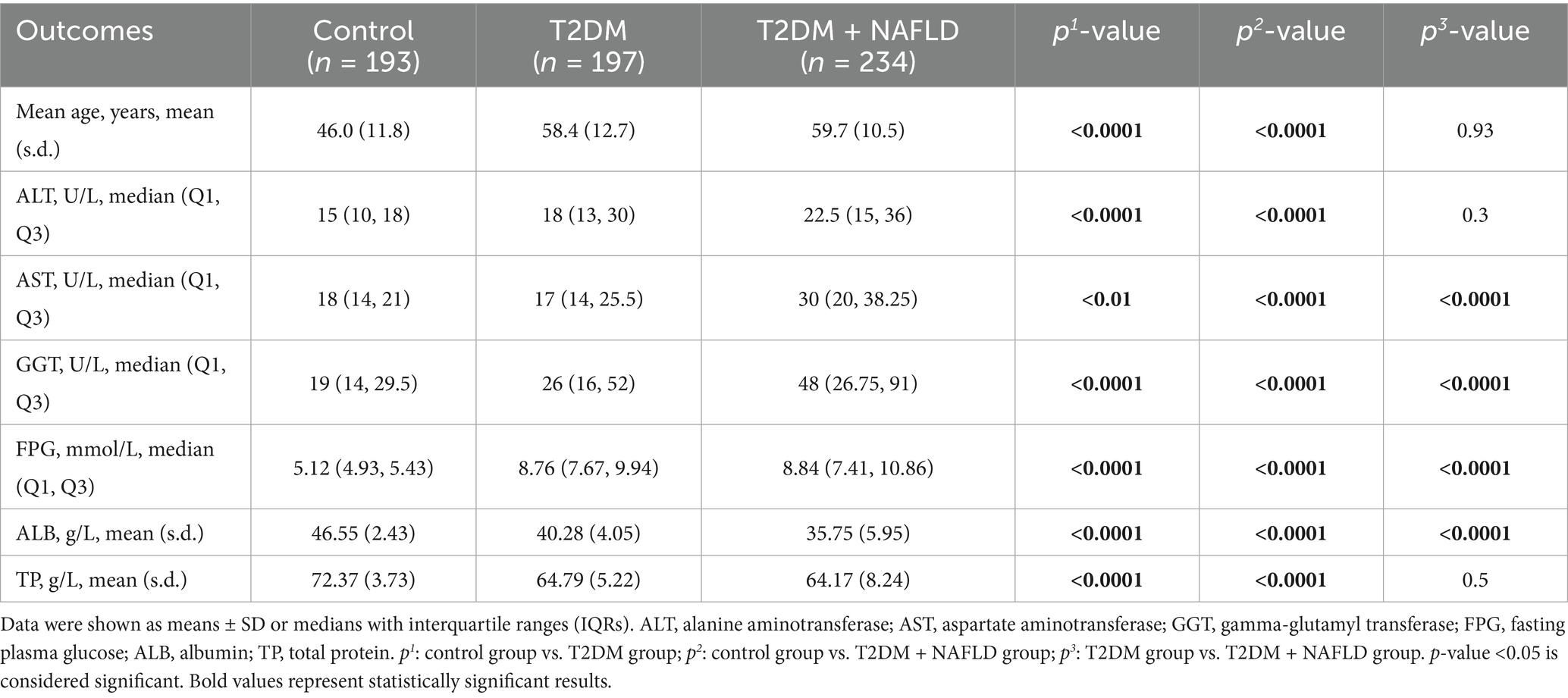 This cross-sectional study enrolled a cohort of 624 adults (341 males; 283 females) aged 21–84 years. Based on clinical characteristics, the population comprised three distinct groups: 197 individuals diagnosed with T2DM, 234 with T2DM and NAFLD, and 193 healthy controls. Table 1 summarizes the characteristics of age, ALT, AST, GGT, FPG, ALB, and TP across study groups, expressed as the mean (SD)/IQR. The indicators in the control group were 46.0 (11.8), 15 (10, 18), 18 (14, 21), 19 (14, 29.5), 5.12 (4.93, 5.43), 46.55 (2.43), and 72.37 (3.73), the T2DM cohort were 58.4 (12.7), 18 (13, 30), 17 (14, 25.5), 26 (16, 52), 8.76 (7.67, 9.94), 40.28 (4.05), and 64.79 (5.22), and the T2DM and NAFLD group indicators were 59.7 (10.5), 22.5 (15, 36), 30 (20, 38.25), 48 (26.75, 91), 8.84 (7.41, 10.86), 35.75 (5.95), and 64.17 (8.24).