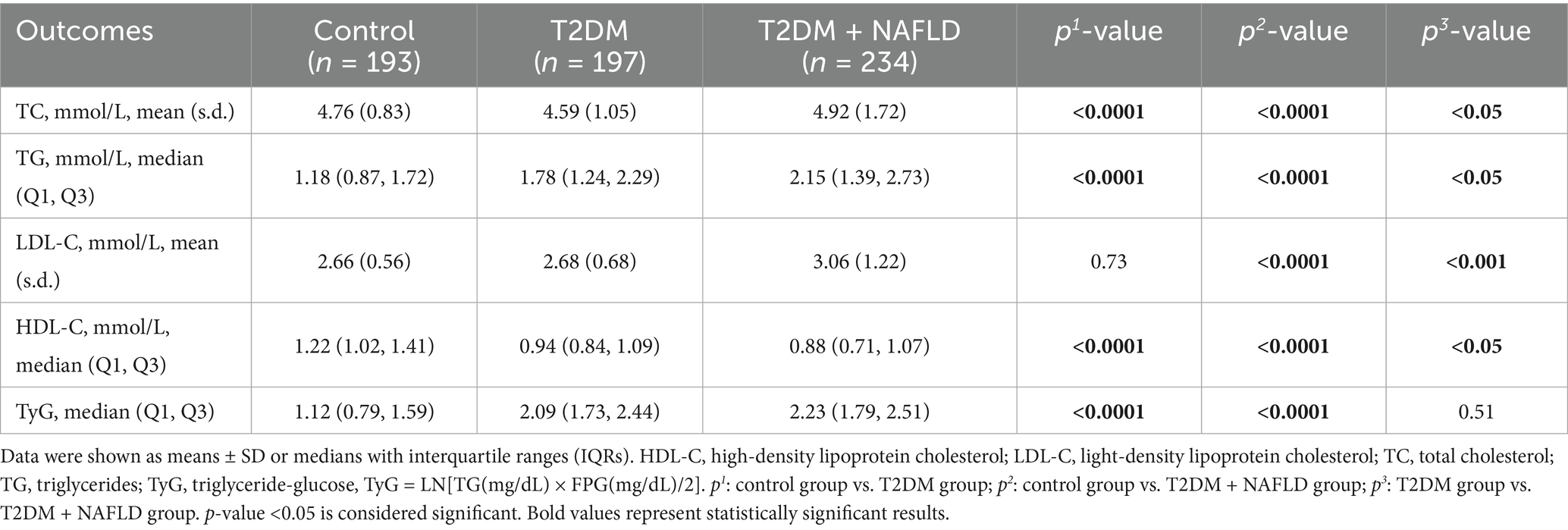 Table 2 showed statistically different lipid metabolism characteristics between cohorts with and without T2DM or NAFLD comorbidity, except for LDL-C (control vs. T2DM) and TyG index (T2DM vs. T2DM + NAFLD). Meanwhile the participants with NAFLD comorbidity tended to have an advanced TyG index. It is worth noting that participants with T2DM and NAFLD exhibited statistically increased levels of TC, TG, LDL-C, TyG and reduced level of HDL-C. Moreover, compared with the control group, the levels of TC, TG, LDL-C, and TyG in T2DM individuals were higher, while the HDL-C level was lower. These findings indicate that the participants with T2DM and NAFLD have hyperlipidemia.