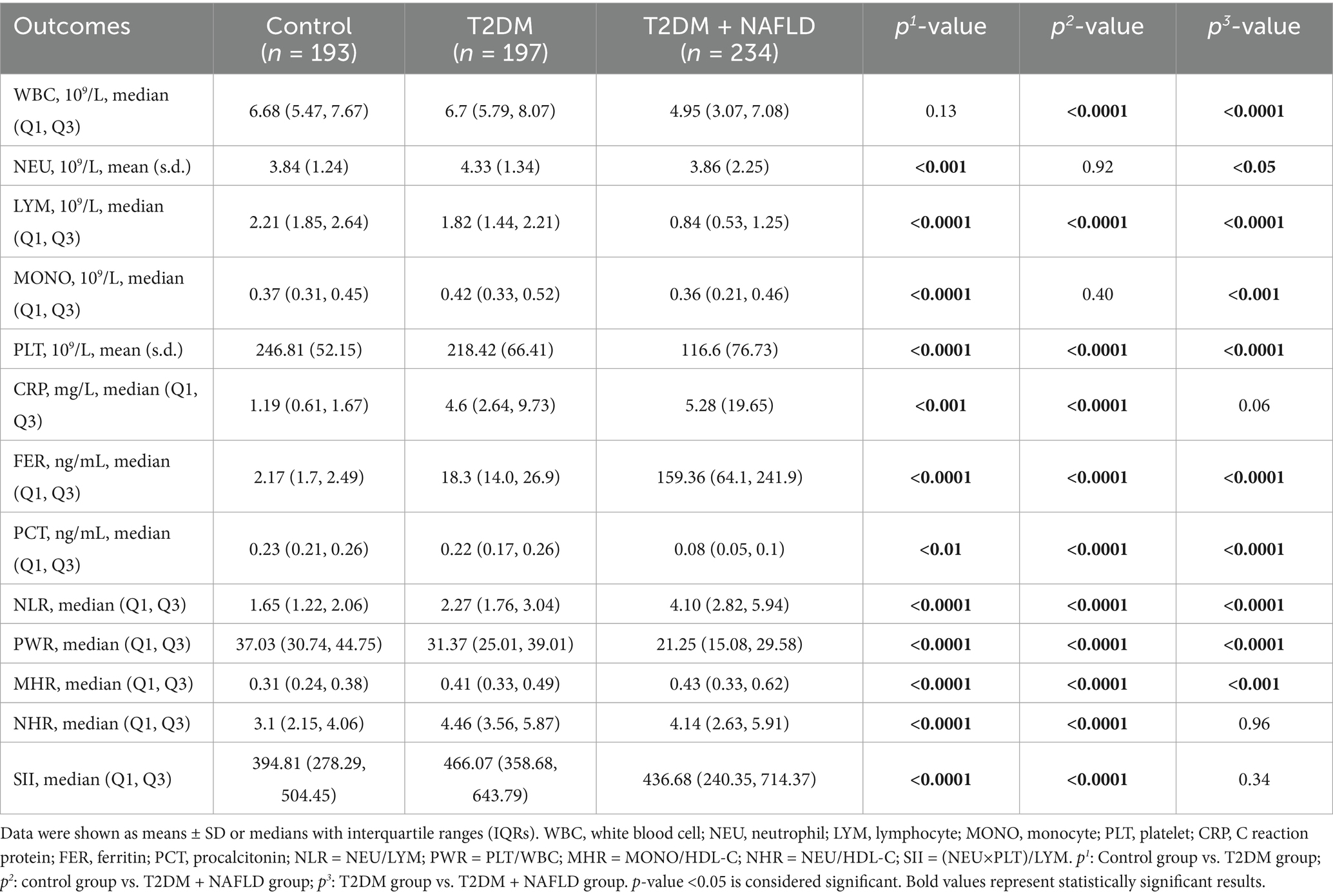 The SD and IQR of inflammatory characteristics variables are shown in Table 3. Compared to the control group, the T2DM cohort demonstrated increased levels of NEU, MONO, CRP, FER, NLR, MHR, NHR, and SII, alongside decreased levels of LYM, PLT, PCT, and PWR. Notably, there was no significant difference in WBC between the two groups. Additionally, Compared to the control group, the T2DM and NAFLD cohort exhibited elevated levels of NEU, CRP, FER, NLR, MHR, NHR and SII couple with attenuated levels of WBC, PLT, PCT and PWR. Furthermore, comparative analysis between the T2DM cohort and the T2DM + NAFLD comorbid cohort revealed intensified inflammatory activity in comorbid patients with higher levels of CRP, FER, NLR, and MHR. While the levels of NHR and SII in the comorbid cohort were lower than in the T2DM cohort. We hypothesized that these results may be related to lower level of WBC in participants with T2DM and NAFLD. These hematologic characteristics may reflect compensatory immunosuppression mechanisms in progressive metabolic.