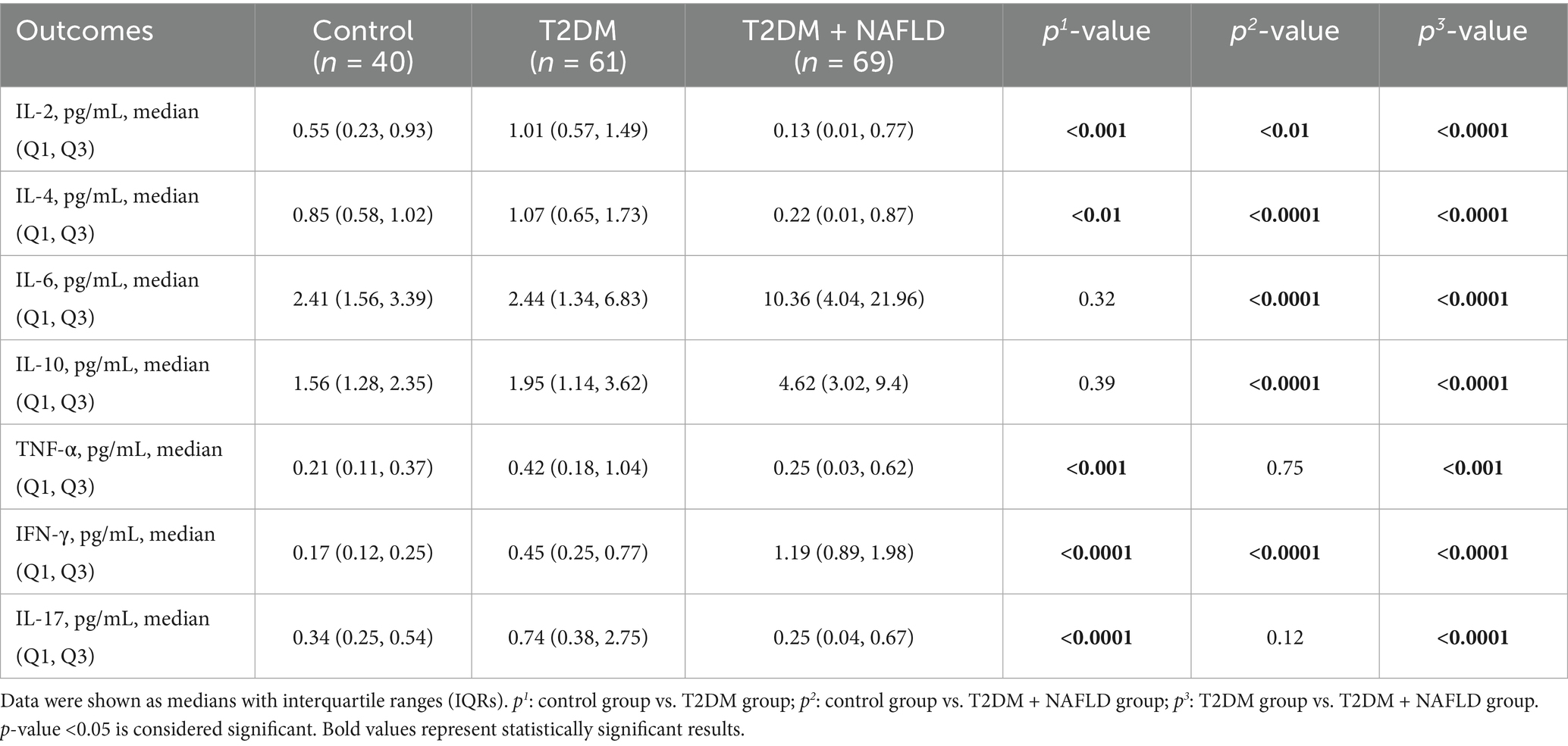 To further delineate the inflammatory spectrum in NAFLD progression, a stratified random sampling approach was employed. The distribution trends within the subsample were similar to those of the overall sample. Subsequently cytokines profiling was systematically conducted. As detailed in Table 4, the T2DM + NAFLD cohort demonstrated statistically elevated concentrations of IL-6, IL-10, and IFN-γ compared to mono disease cohorts, whereas the concentrations of IL-2, IL-4, and IL-17 were reduced. Additionally, the expression levels of differential cytokines across clinical subgroups were exhibited more clearly in Figure 1, which revealed distinct inflammatory signatures associated with disease progression.