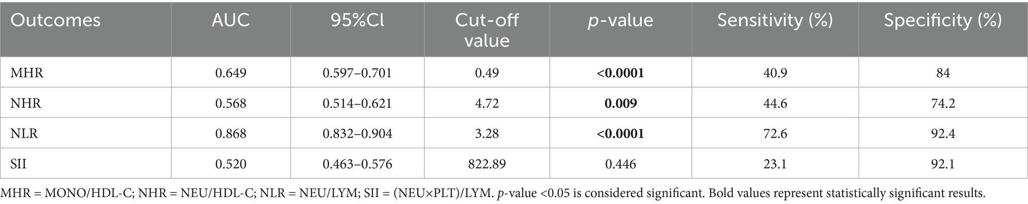 Table 13. ROC analysis of MHR, NHR, NLR, and SII.