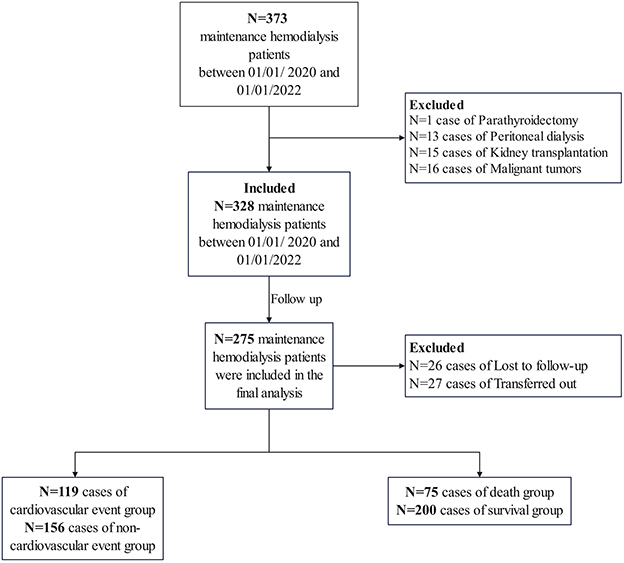 The flowchart of patient selection for this study is presented in Figure 1. A total of 373 patients undergoing MHD were identified at our hospital between January 1, 2020, and January 1, 2022. Patients with a history of parathyroidectomy (n = 1), peritoneal dialysis (n = 13), renal transplantation (n = 15), or malignancy (n = 16) were excluded. Ultimately, 328 patients were included in the study and followed up until June 30, 2024. During this period, 26 patients were lost to follow-up, and 27 were transferred to other dialysis centers. Consequently, 275 participants were included in the final analysis. The median age of the participants was 56.0 years [interquartile range (IQR) 48.0–67.0], and the median dialysis vintage was 64.0 months (IQR 41.0–92.0). The cohort comprised 62.2% males. The primary underlying renal diseases were chronic glomerulonephritis (39.3%), diabetic nephropathy (28.7%), and hypertensive nephropathy (18.9%). The remaining 13.1% of patients had other renal diseases, including polycystic kidney disease, obstructive nephropathy, gouty nephropathy, etc. The overall rate of missing data was 0.51%, and these missing values were imputed using the median method, as detailed in Supplementary Table 1.