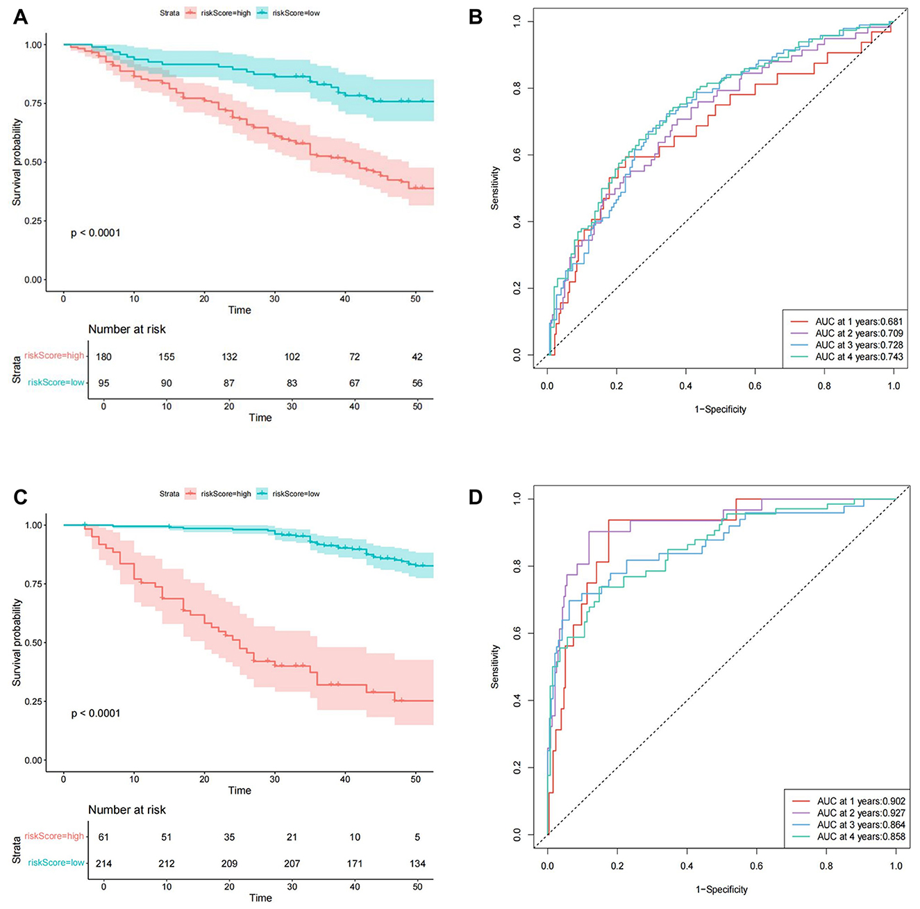 Figure 2. The Cox model prediction results. (A) The Kaplan-Meier survival plot of cardiovascular events. (B) The time-dependent ROC plot of cardiovascular events. (C) The Kaplan-Meier survival plot of all-cause mortality. (D) The time-dependent ROC plot of all-cause mortality.