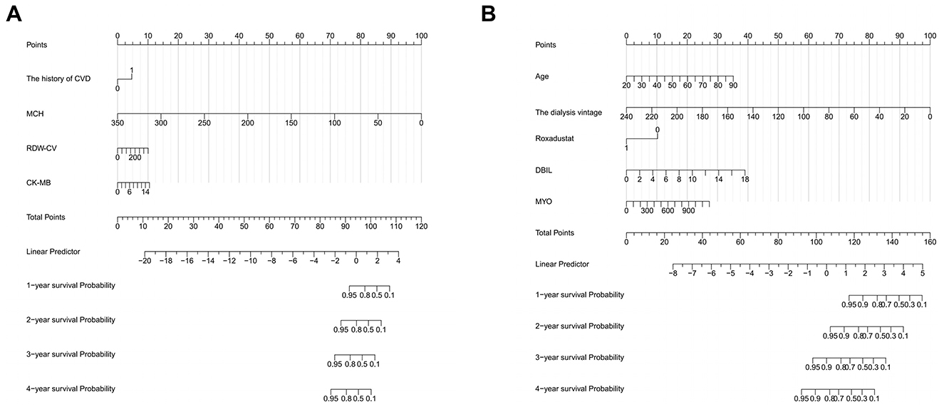 In predicting all-cause mortality, multivariate Cox regression analysis identified several independent risk factors: age (HR: 1.030, 95% CI: 1.003–1.058), direct bilirubin (DBIL) (HR: 1.235, 95% CI: 1.003–1.520), myohemoglobin (MYO) (HR: 1.0023, 95% CI: 1.000–1.004), dialysis vintage (HR: 0.95, 95% CI: 0.935–0.966), and the use of roxadustat (HR: 0.395, 95% CI: 0.193–0.810). Based on a cutoff value of 1.87, subjects were stratified into high-risk (cutoff > 1.87) and low-risk (cutoff ≤ 1.87) groups for all-cause mortality, comprising 61 and 214 cases, respectively. The Kaplan-Meier survival plot demonstrated a significant difference in survival between the high-risk and low-risk groups (P < 0.001) (Figure 2C). The time-dependent ROC plot showed AUC values for predicting all-cause mortality at 1, 2, 3, and 4 years were 0.902, 0.927, 0.864, and 0.858, respectively (Figure 2D). Finally, the nomograms for predicting CVE (Figure 3A) and all-cause mortality (Figure 3B) were constructed based on the selected independent factors. Each variable was first scored on its corresponding subscale. Subsequently, the scores of all variables were summed to obtain a total score, which corresponded to the risk of CVE or all-cause mortality occurrence.