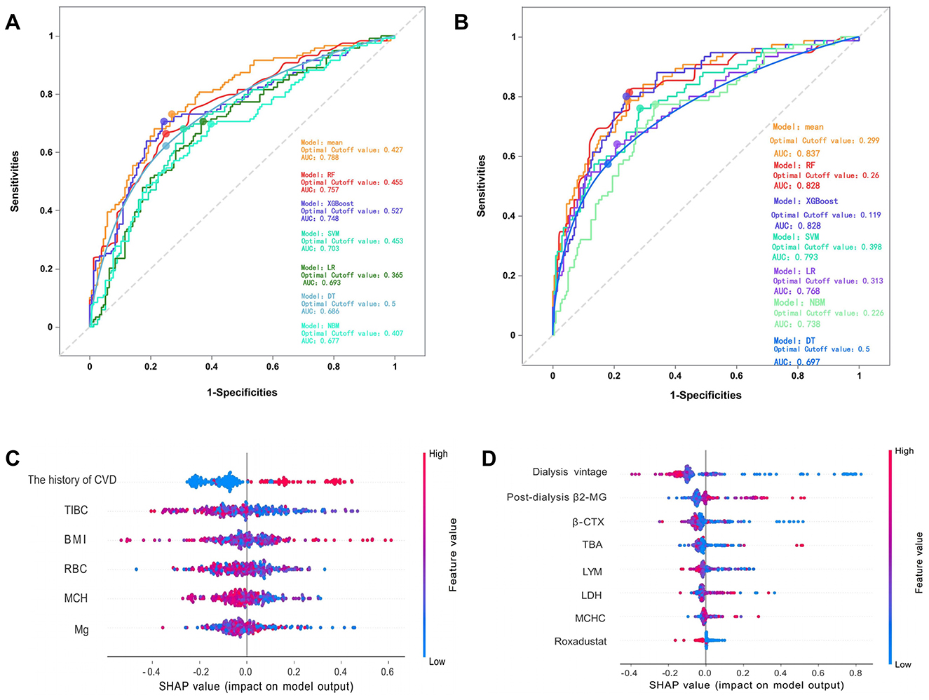 Figure 4. (A) The overall ROC curves for predicting cardiovascular events by various models. (B) The overall ROC curves for predicting all-cause mortality by various models. (C) The SHAP values of the best features in XGBoost. (D) The SHAP values of the best features in RF. The SHAP plot displays features in descending order of importance from top to bottom, with those at the top exerting a greater overall influence on the model's output, while those below exert a lesser influence. The horizontal axis represents the SHAP value, indicating each feature's contribution to the model's prediction outcome and its direction. A positive value signifies that the feature increases the predicted value of the model's output, while a negative value indicates that it decreases the predicted value. SHAP, SHapley Additive exPlanation; CVD, cardiovascular disease; TIBC, total iron binding capacity; BMI, body mass index; RBC, red blood cell count; MCH, mean corpuscular hemoglobin; Mg, magnesium. β2-MG, β2-microglobulin; β-CTX, B-Carboxy-Terminal Peptide Of Type I Collagen; TBA, total bilirubin; LYM, lymphocytes; LDH, lactate dehydrogenase; MCHC, mean corpuscular hemoglobin concentration.