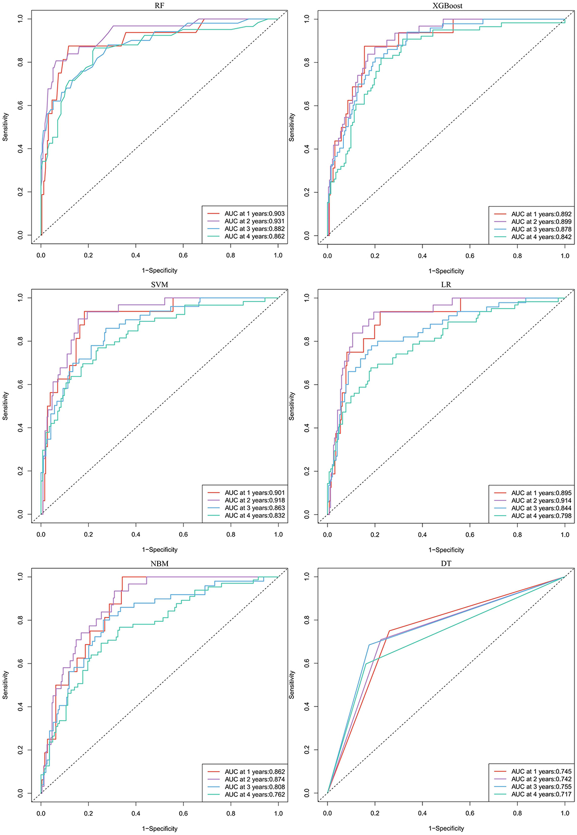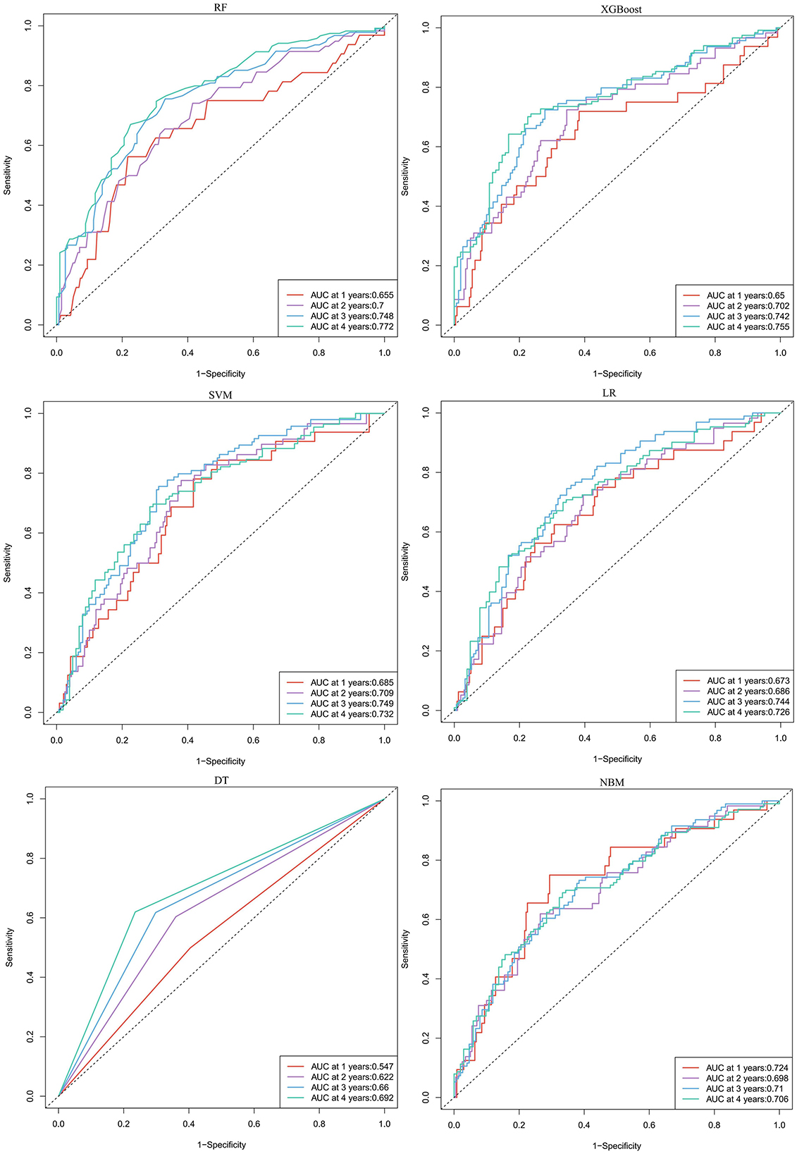 Figure 6. The time-dependent ROC curves for predicting all-cause mortality by six machine learning models. RF, random forest; XGBoost, extreme gradient boosting; LR, logistic regression; SVM, support vector machine; DT, decision tree; NBM, naive bayesian model.