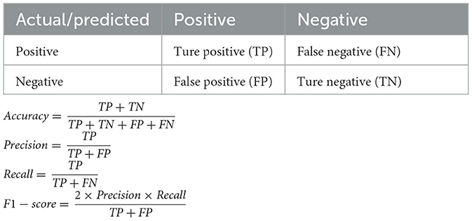 As our ML models were binary classifiers, their performance was evaluated using several key metrics: accuracy, recall, precision, F1-score, and AUC. These metrics were derived from the four possible outcomes of binary classification: true positive (TP), true negative (TN), false positive (FP), and false negative (FN) (Table 1). Accuracy measures the proportion of correct predictions (both TP and TN) among all subjects. Recall (also known as sensitivity or the “TP rate”) represents the proportion of actual non-surviving patients that are correctly identified as non-surviving by the classifier. Precision indicates the proportion of TP results among all positive predictions, reflecting the classifier's ability to avoid FP results. F1-score is the harmonic mean of precision and recall, providing a balanced measure of the two. Specificity (also known as the “TN rate”) measures the proportion of actual surviving patients that are correctly predicted to survive. AUC was computed by plotting sensitivity against 1-specificity across all possible cutoff points. It serves as an overall measure of the model's discrimination ability, with higher AUC values indicating better performance.