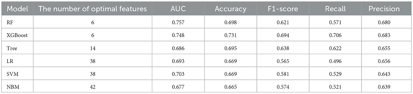 ML models were developed using Python software (version 3.10.0). Six classical ML algorithms were employed to predict the risk of CVE and all-cause mortality in MHD patients. These algorithms included logistic regression (LR), support vector machine (SVM), random forest (RF), decision tree (DT), extreme gradient boosting (XGBoost), and Naive Bayesian model (NBM). The primary functions of these algorithms were defined, and the models were iteratively trained with varying numbers of features to generate corresponding prediction results and performance reports. Five-fold cross-validation was used for internal validation, and the average values of these validations were accepted as the final results to mitigate the risk of overfitting.