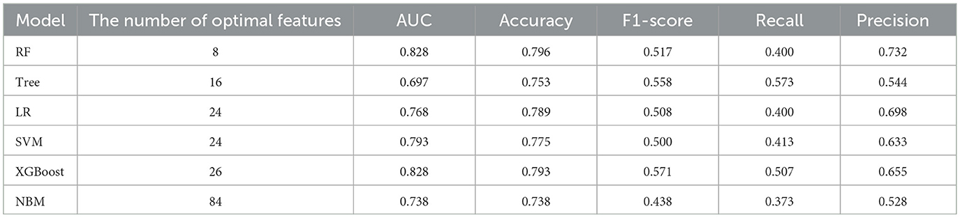 In predicting CVE, the average overall AUC of the six ML models was 0.788. Among these models, RF achieved the highest AUC value of 0.757, followed by XGBoost, SVM, LR, DT, and NBM (Figure 4A). The time-dependent ROC curves of these models demonstrate that prediction performance improves gradually as the prediction time extends (Figure 5). Detailed performance evaluations of the six ML models are presented in Table 2. Notably, both RF and XGBoost required the fewest predictors to achieve optimal prediction performance. Although RF had the highest AUC value, XGBoost outperformed it in terms of accuracy, recall, precision, and F1 score. Therefore, XGBoost was identified as the optimal prediction model for CVE. The SHAP plot ranked the variables according to their contribution to the XGBoost model's output. The most important feature variable was the history of CVD, followed by total iron-binding capacity (TIBC), body mass index (BMI), red blood cell (RBC) count, MCH, and serum magnesium (Mg) (Figure 4C).