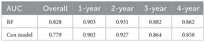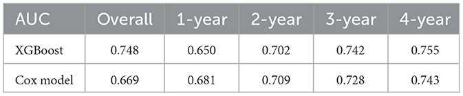 As illustrated in Tables 4, 5, the XGBoost model demonstrates superior overall predictive performance compared to the Cox regression model in predicting CVE. While the Cox regression model exhibits slightly better performance in the first and second years, it still falls short of XGBoost in predicting the third and fourth years. In predicting all-cause mortality, RF consistently outperforms the Cox regression model both in overall performance and at each individual time point.