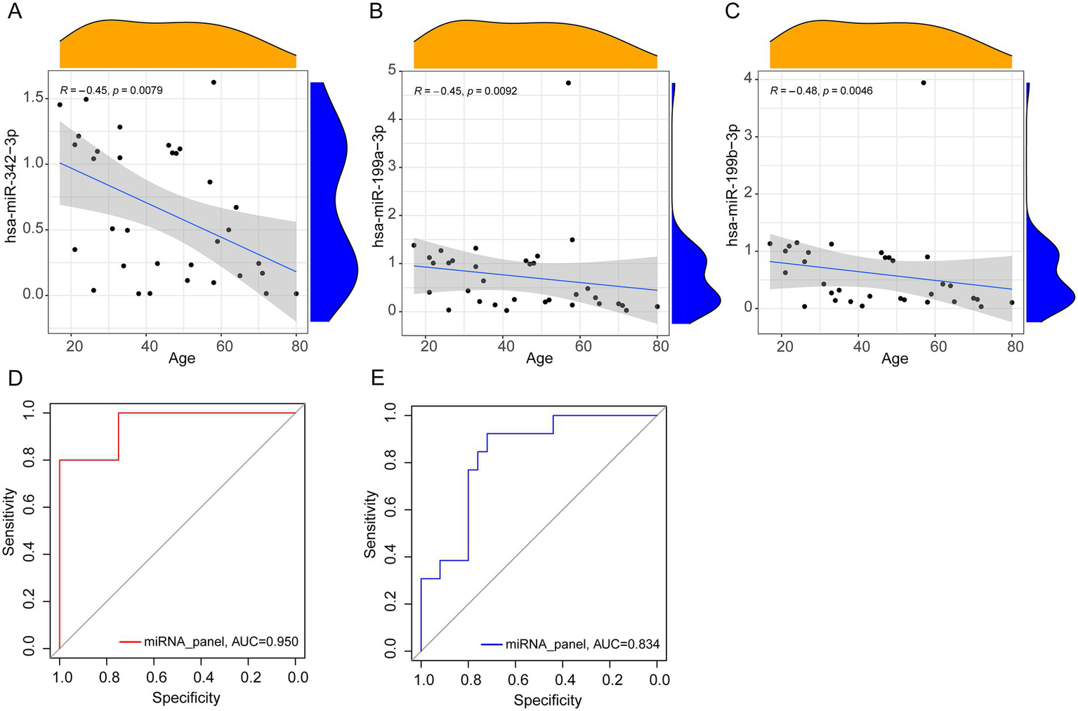 Correlation analysis and ROC curves. (A–C) Spearman correlation analysis between miRNA relative expression levels and age (PTB, n = 33). (D,E) The area under the ROC curve of the younger (PTB, n = 20, LC, n = 4) and older group (PTB, n = 13, LC, n = 25).