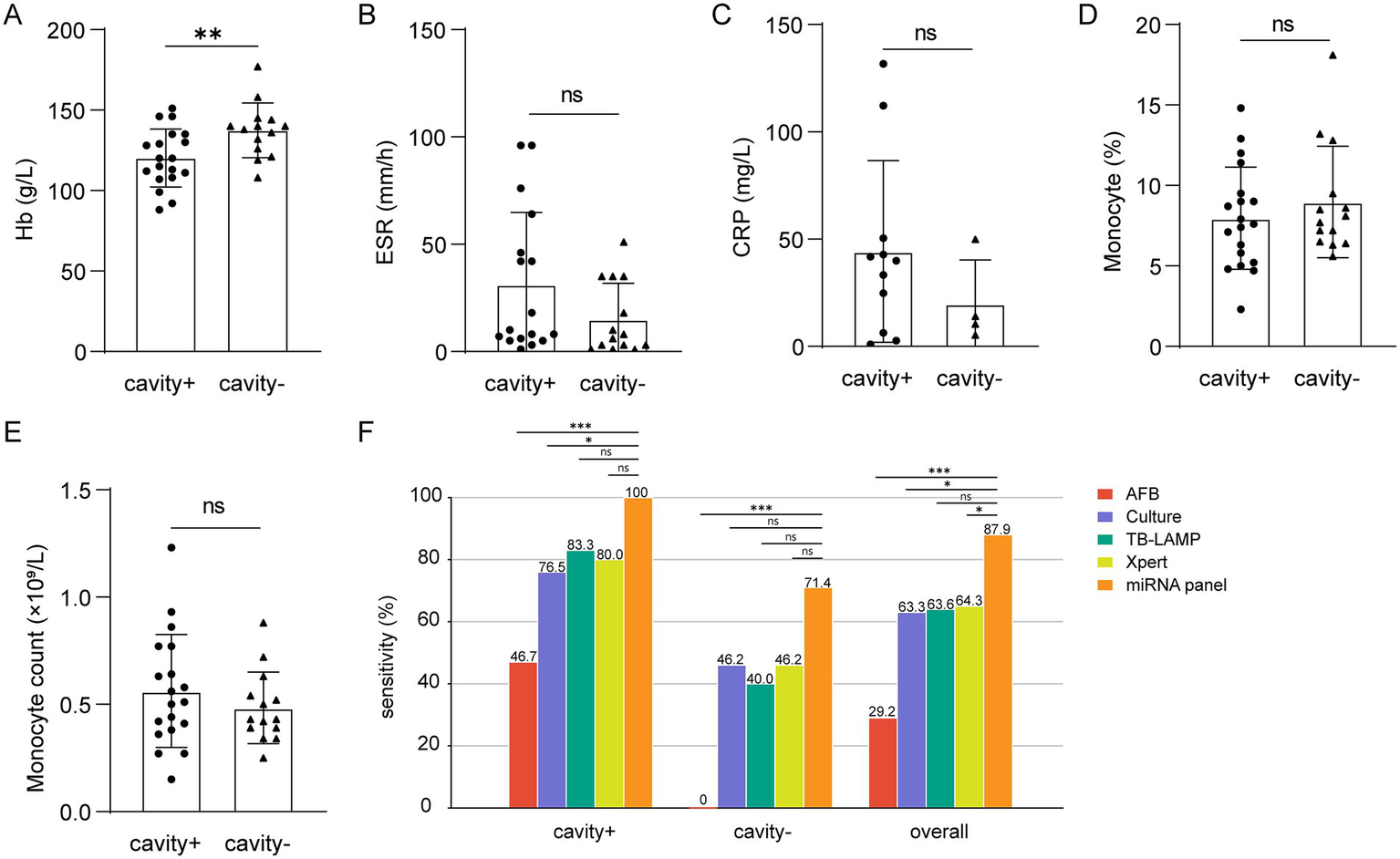 Differences in severity-related indicators and sensitivity comparison of different groups. (A–E) Hb (cavity+, n = 19, cavity−, n = 14), ESR (cavity+, n = 17, cavity-, n = 14), CRP (cavity+, n = 11, cavity−, n = 4), monocyte percentage (cavity+, n = 19, cavity−, n = 14) and count (cavity+, n = 19, cavity−, n = 14). (F) Comparison of miRNA panel, AFB smear, MTB culture, TB-LAMP, and Xpert assays among patients with or without cavity. ns, no significance. * p < 0.05. ** p < 0.01. *** p < 0.001.