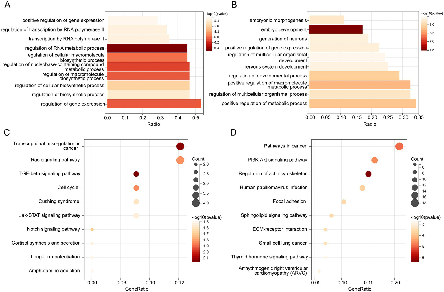 GO and KEGG enrichment. Bar plot shows the biological process (BP) of GO Enrichment Analysis with target mRNAs of hsa-miR-342-3p (A) and hsa-miR-199a/b-3p (B). (C) KEGG pathway enrichment of hsa-miR-342-3p. (D) KEGG enrichment of hsa-miR-199a/b-3p.