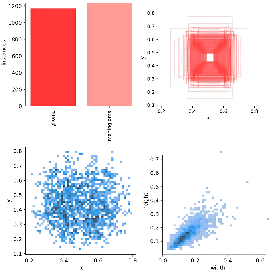 As shown in Figure 5, the scatter plot presents the key distribution characteristics of the annotation boxes. Using Matplotlib, the axes were automatically scaled to the actual distribution range of the data to reveal the details more clearly. The specific explanations are as follows: (1) distribution of the target center point (left sub-figure): x-axis 0.2–0.8, y-axis 0.2–0.6, indicating that the tumor center is concentrated in the center of the MRI image, without edge targets. This is in line with the characteristics of clinical scans, as the head is always positioned at the center point of the magnetic field. (2) Distribution of the target width and height (right sub-figure): axes 0.2–0.6, showing that the tumor size is medium and uniform, without extreme outliers; the clustering of points indicates that the aspect ratio is nearly symmetrical, which is consistent with the typical morphology of gliomas and meningiomas.