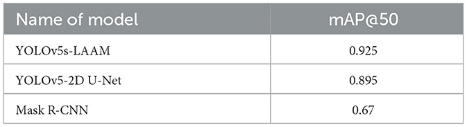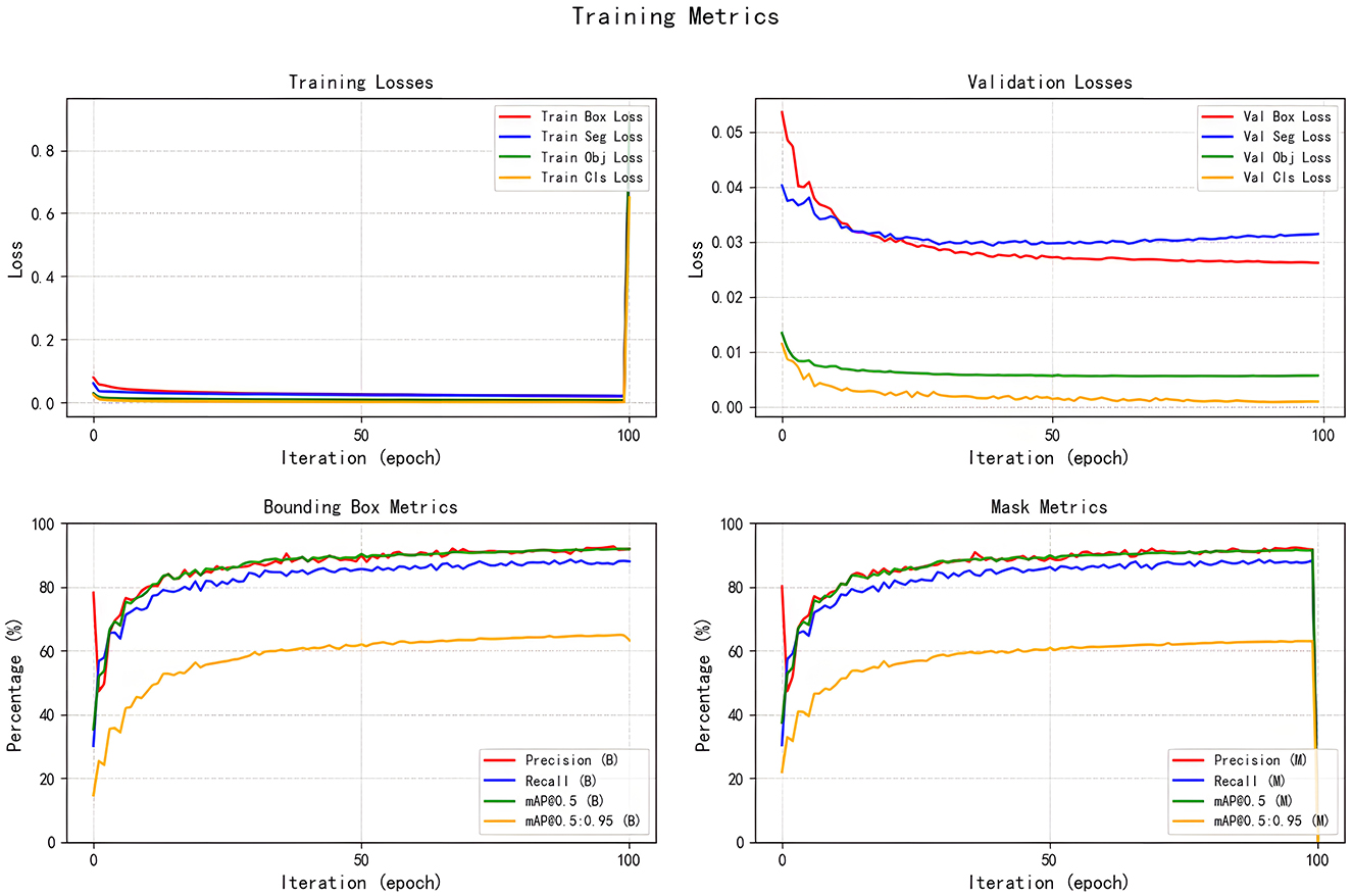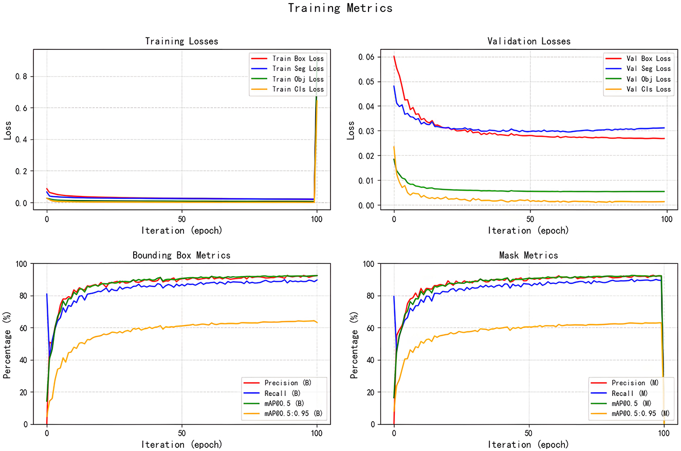 Drawing on previous studies (31), in this study, the model performance was measured using Precision, Recall, mAP@50 and GFLOPs. These evaluation metrics, similar to the Dice Similarity Coefficient (DSC), respectively reflect different aspects of the model performance. They are complementary to each other. DSC focuses on the consistency of pixel-level segmentation results with the true annotations in terms of spatial overlap, and is suitable for evaluating the quality of fine segmentation based on pixel-wise classification. In target detection and instance segmentation tasks, mAP@50 is a more general comprehensive evaluation metric. This metric calculates the area under the precision-recall curve at a specific IoU threshold to comprehensively assess the overall performance of localization accuracy and classification confidence. Therefore, mAP@50 can not only reflect localization accuracy but also reliability of recognition, and is a more comprehensive assessment of the overall performance of detection and segmentation.