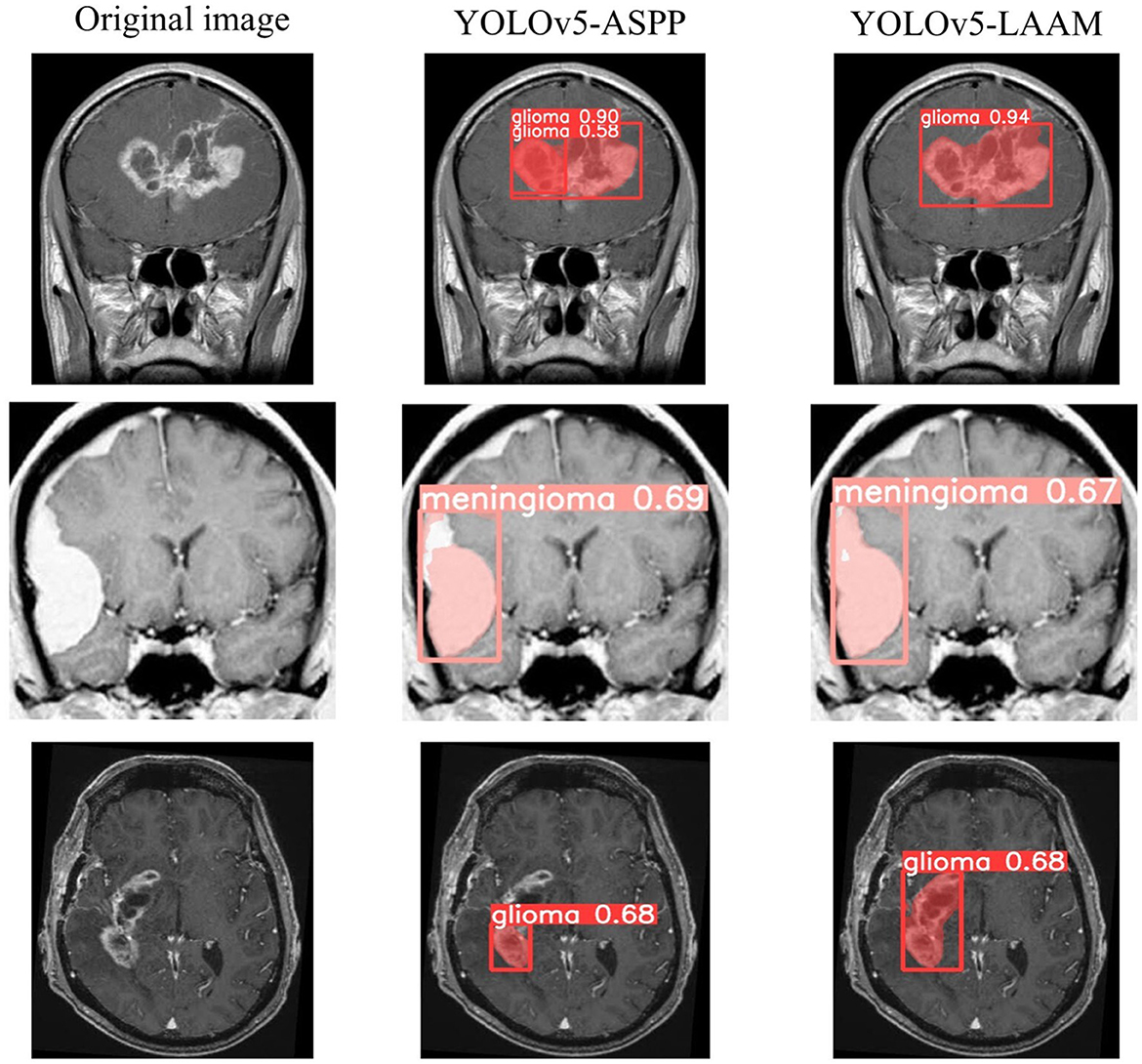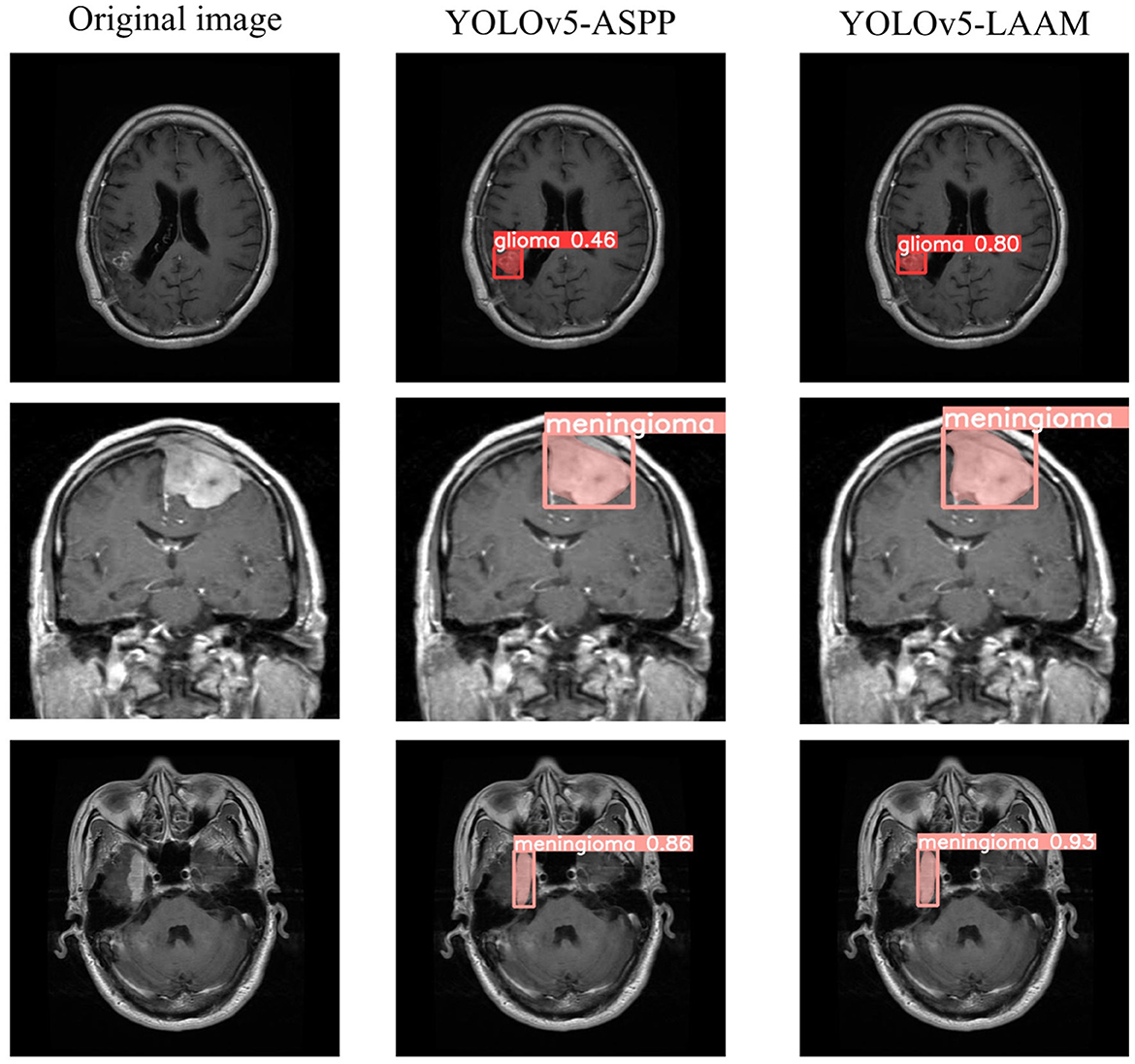 Overall, the YOLOv5s-LAAM proposed in this paper demonstrates advantages in both accuracy and efficiency. EoFormer (35), based on the Transformer architecture, effectively extracts tumor boundary features, but has a high computational complexity; the MFI method is good at handling multimodal missing issues (36), but has not fully optimized the computational efficiency and global feature extraction capability. The method proposed in this study achieves higher accuracy and recall rate while maintaining a lower computational cost, achieving a good balance between multi-scale feature perception, modality adaptability, and computational efficiency, and is more suitable for clinical practical environments.