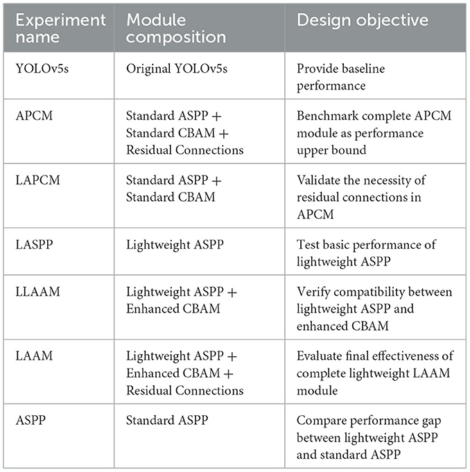 The ASPP and CBAM demonstrate significant advantages in feature extraction and attention mechanisms, yet exhibit certain limitations. The ASPP captures contextual information across varying receptive fields through multi-scale atrous convolutions, effectively enhancing the model's adaptability to multi-scale targets (24). Kumar (25) conducted ablation experiments integrating their novel ASPP with the baseline Tiny YOLOv7 model, achieving significant performance gains of 17 % improvement in precision, 1 % increase in recall rate, 11 % enhancement in F1-score, and 12.55 % boost in mean Average Precision (mAP) compared to the baseline, demonstrating multiplicative improvements in detection capability. However, this approach incurs high computational complexity, with substantial increases in parameter count and computational load, particularly with high-resolution inputs or large channel dimensions, potentially compromising training and inference efficiency. Furthermore, the ASPP exhibits limited capacity in capturing localized detail information, as its design prioritizes the extraction of global contextual features. This may lead to the neglect of certain critical local characteristics, potentially creating performance bottlenecks in tasks requiring fine-grained localization.