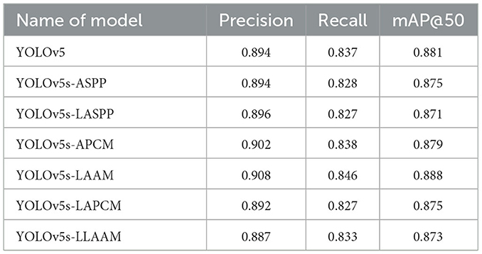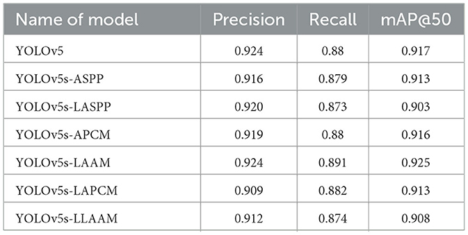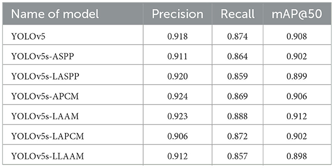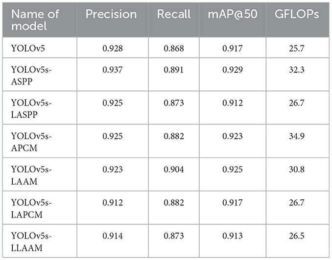 Results: The enhanced YOLOv5s-LAAM model demonstrated superior performance, achieving a precision of 92.3 %, a recall rate of 90.4 %, and an mAP@50 score of 0.925. Concurrently, the model exhibited significantly reduced computational demands, with the GFLOPs reduced by 15 % compared to the original YOLOv5s-ASPP baseline.