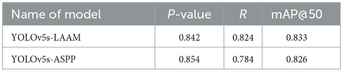 The training curves and optimal weight files of the YOLOv5s-ASPP and YOLOv5s-LAAM models, along with their performance on the internal and external test sets, are illustrated in Figures 7–10, and detailed in Tables 7, 8. Tables 9, 10 present the inference speed of the two models on the internal and external test sets.