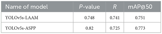 The LAAM module demonstrates a remarkable performance in the internal testing, achieving an mAP@50 of 0.833 and a recall rate of 0.824. Nevertheless, in the external test set, there is a notable decline in precision (P = 0.748) compared to ASPP (P = 0.82), and the mAP@50 (0.751) is inferior to that of ASPP (0.773). This indicates that the generalization capability of the LAAM module has certain limitations.